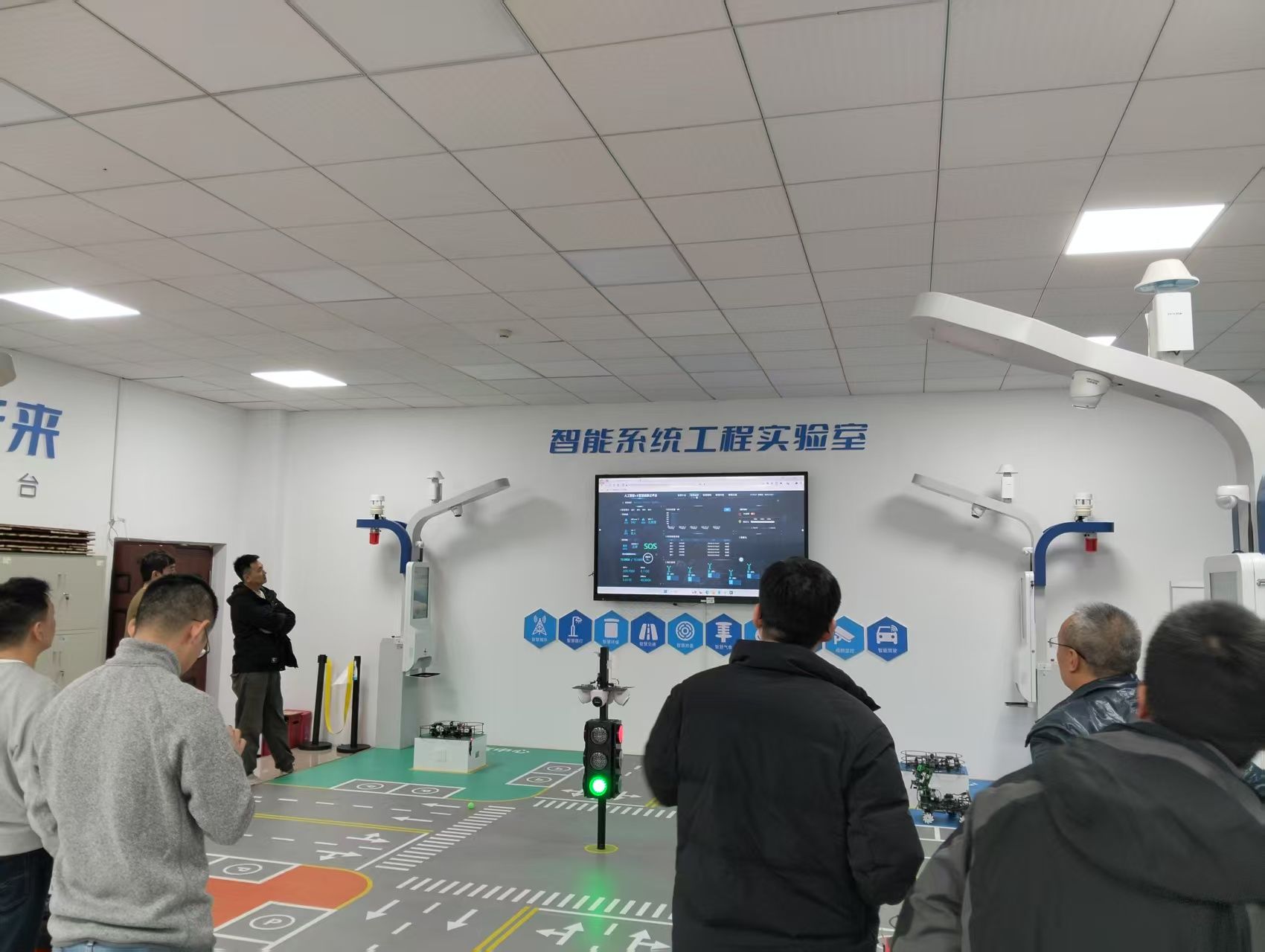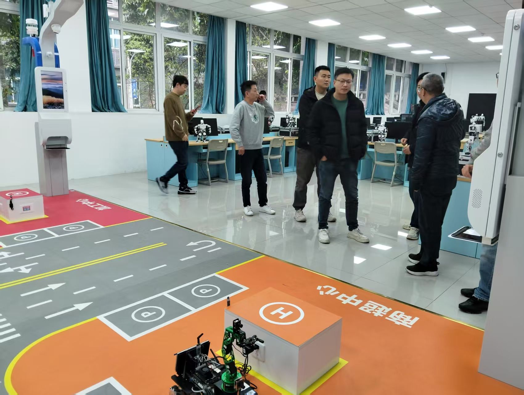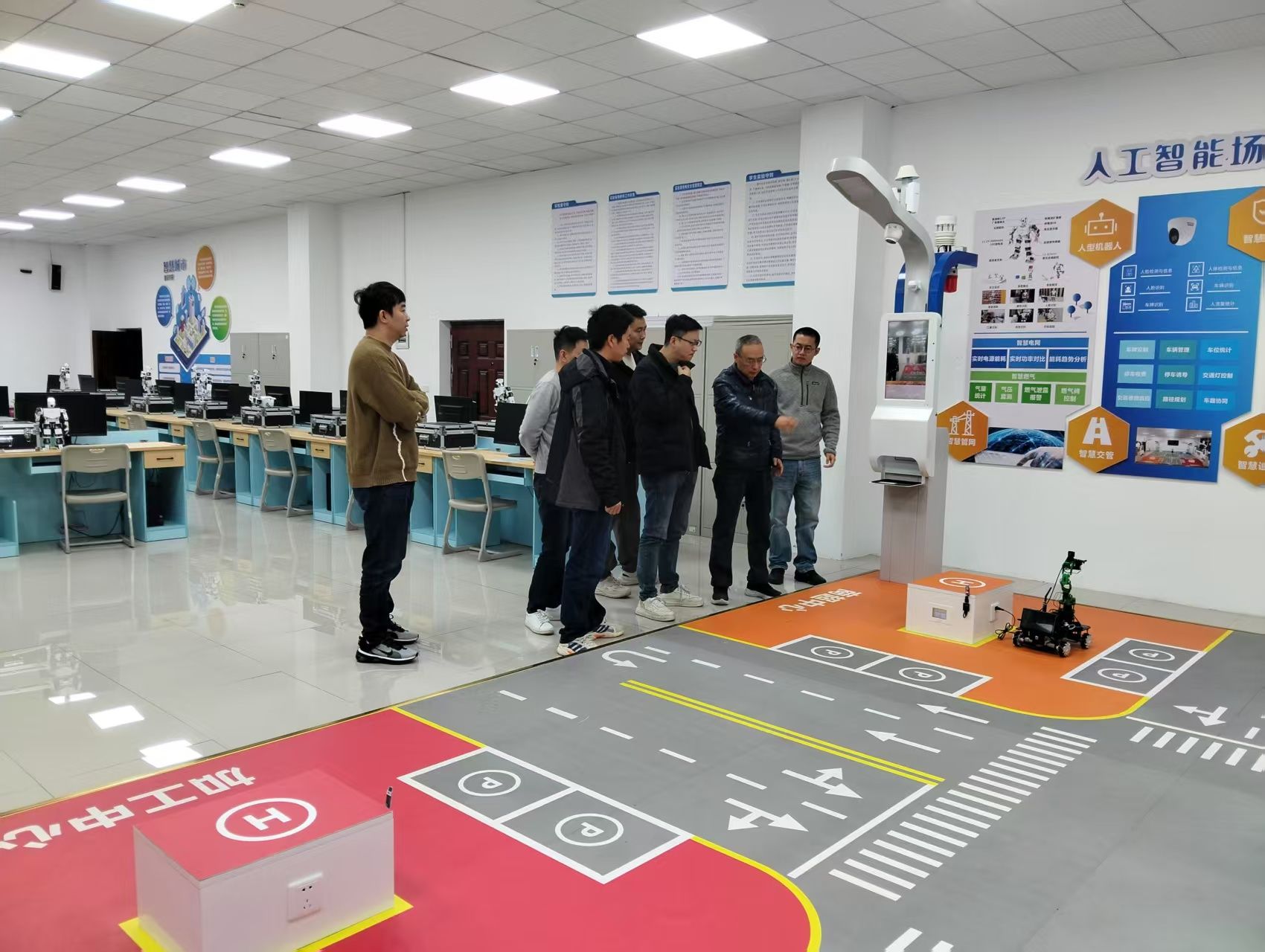 在通信与信息工程学院智能信息技术教研室主任冯文果的陪同下,西南民族大学考察团首先参观了我校智能系统工程实验室。实验室构建了“实体设备-虚拟仿真-场景应用”三位一体的智能技术研训平台,配备人形机器人、智慧农业物联网、AI垃圾分类识别系统和自动驾驶车路协同装置等核心设备。冯老师详细介绍实验室:“我们的实验室不仅服务于日常教学,还承担了机器人竞赛等。人工智能实验室已支撑《智能系统设计》、《智能机器人》、《毕业设计》等多门课程项目化教学,并衍生出智能机器人、智能复合体、工业缺陷检测等多个竞赛课题。”近两年累计获得包含国家一等奖等十余项国家级奖项,省级以上奖励三十余项,实现教学与竞赛的深度互哺。