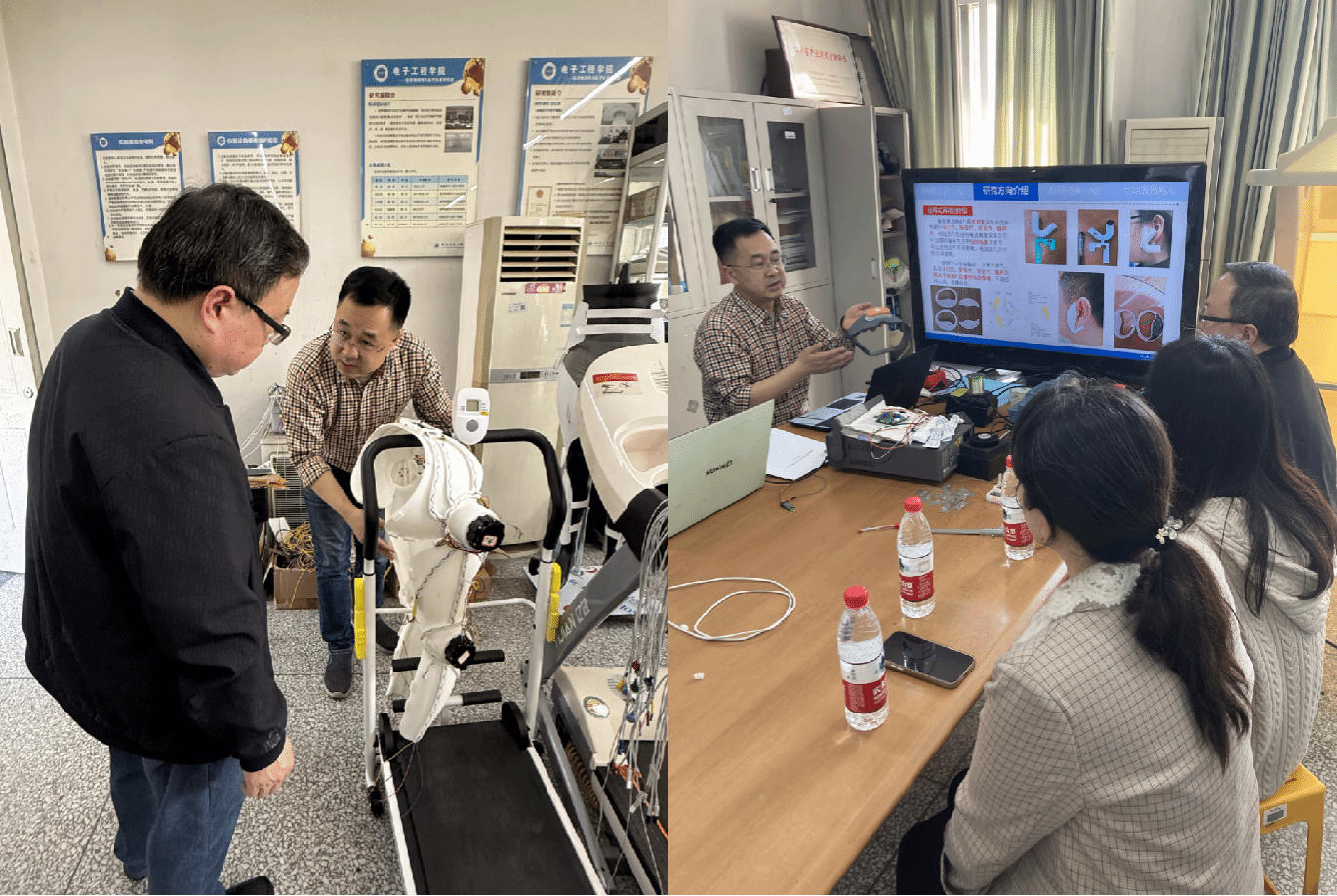 杨波教授带领大家参观了实验室,介绍了他们所在的新型医疗仪器与医学物联网科研团队的整体情况及取得的科研成果,并演示了团队最新研发的可穿戴式背心、挂耳式耳鸣治疗仪等医疗器械。大家对杨教授团队取得的科研成果表现出浓厚的兴趣,高飞处长就重点实验室的运行和管理机制等与杨教授展开了深入交流。