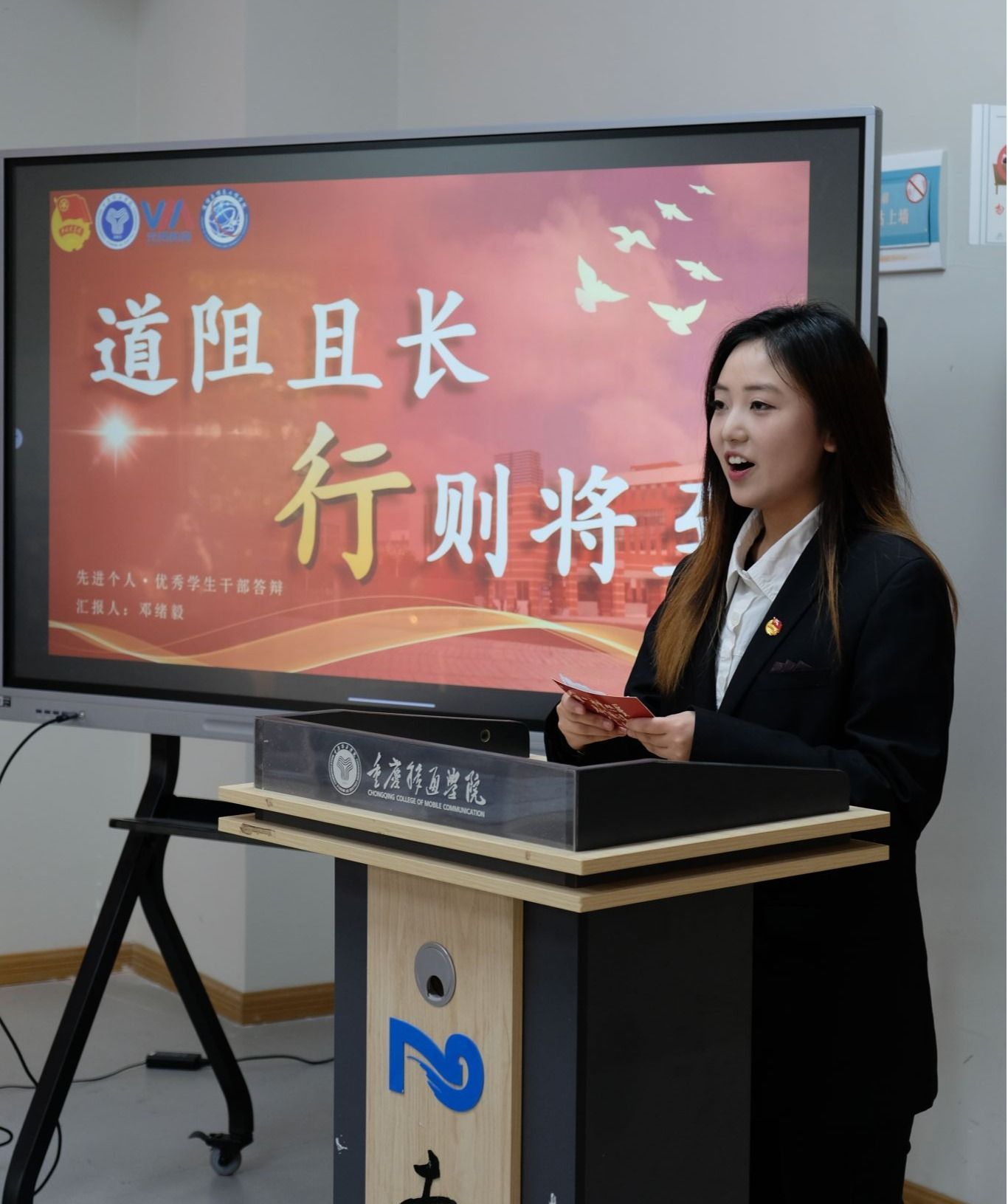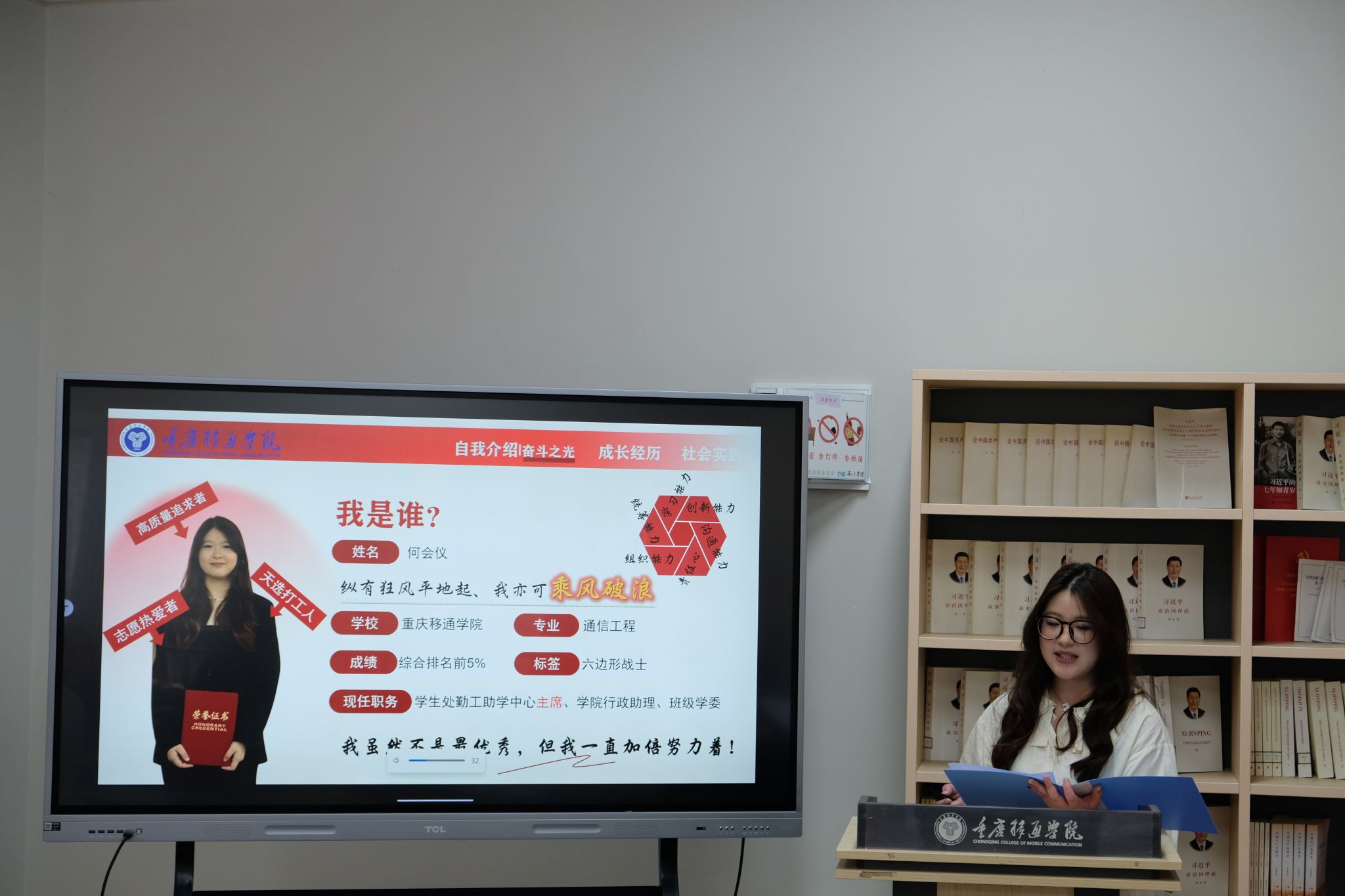 此次答辩环节创新采用“3分钟个人展示 + 2分钟现场答辩”的形式。在个人展示环节,邓绪毅、肖进程、何会仪等参选同学围绕思想进步、学业成绩、工作实践三大维度,展开全面且精彩的汇报。他们分享了在校期间积极向团组织、党组织靠拢的坚定行动,生动讲述了在学生会工作中,组织丰富多元的校园文化活动、全心全意为同学服务的宝贵经历。此外,还通过展示亮眼的专业成绩排名与各类获奖证书,有力证明了自身在学业领域的卓越表现。他们出色的综合素质赢得了评审老师的高度赞誉。而参评班级则借助精心制作的多媒体演示与详实的活动档案材料,全方位、系统化地展示了班级在思想建设、学风营造、志愿服务、创新创业等方面收获的累累硕果。各班级代表以真实数据为支撑,用实际事例作依据,充分彰显了班集体强大的凝聚力与非凡的创造力。