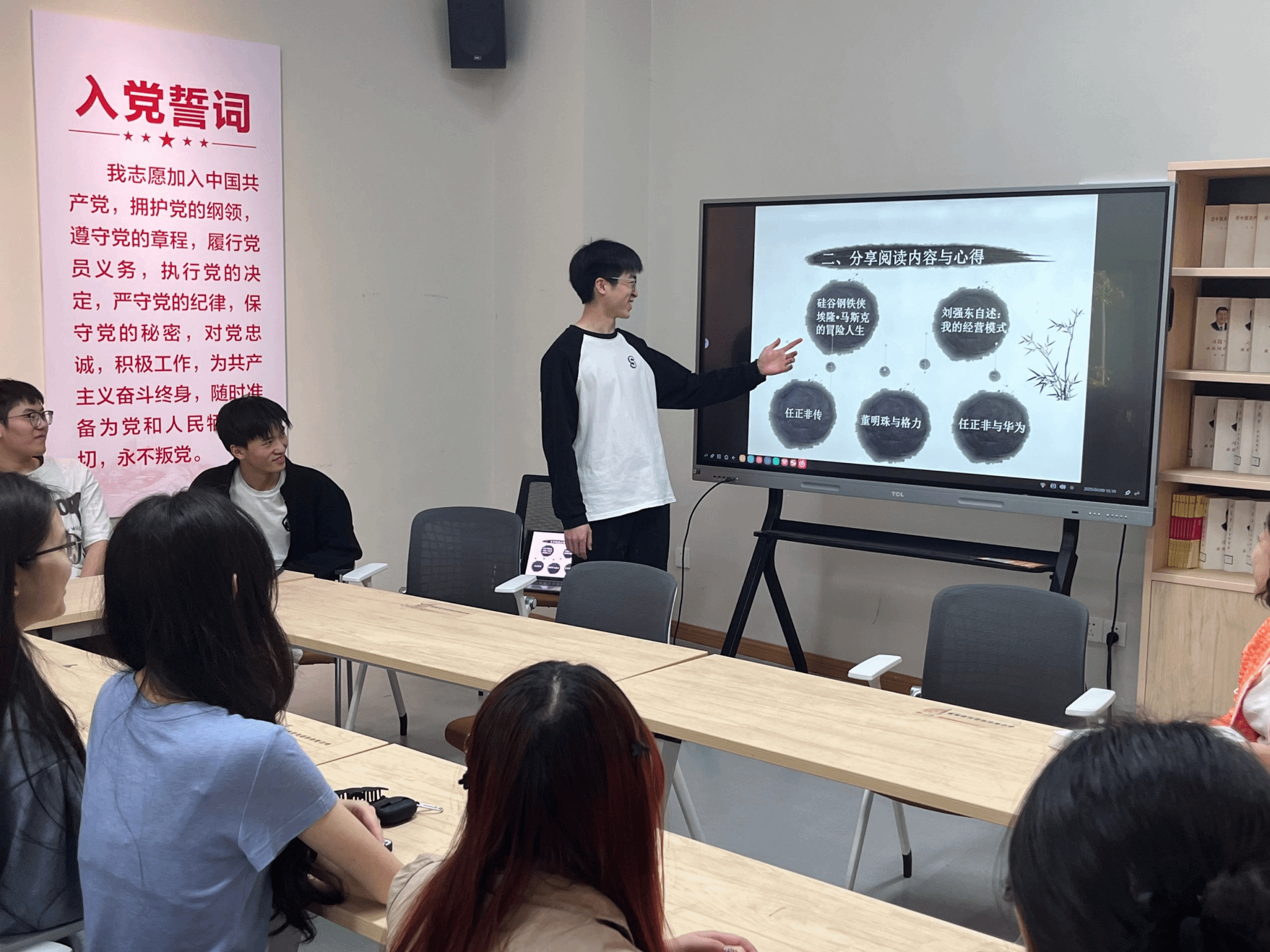 5月14日在天空 302 教室,学业导师胡珺珺老师组织2023 级电信工程与管理志向1班的同学们开展了一场“科创领路・智汇未来”大咖阅读活动。本次活动聚焦《任正非传》《董明珠与格力》《刘强东自传》《马斯特的冒险人生》四本企业家传记,旨在让同学们从商业领袖的传奇经历中汲取智慧,激发创新思维与专业学习的热情。