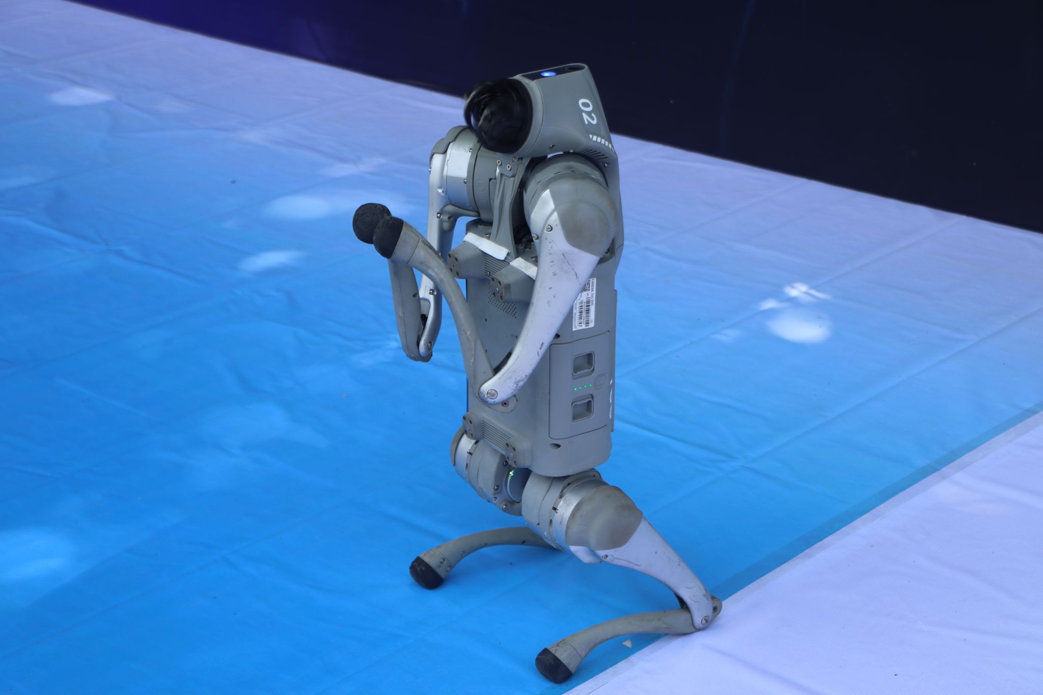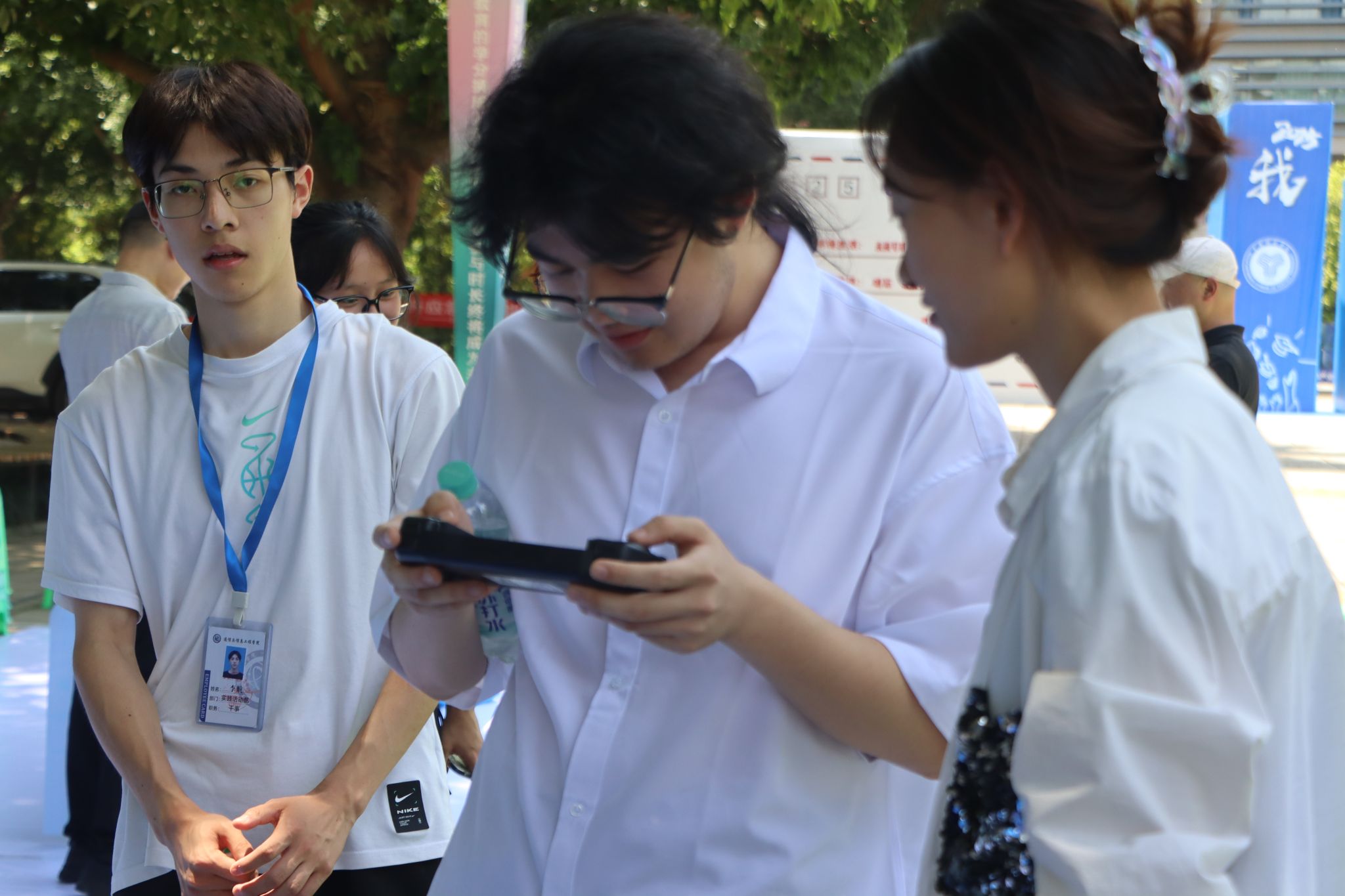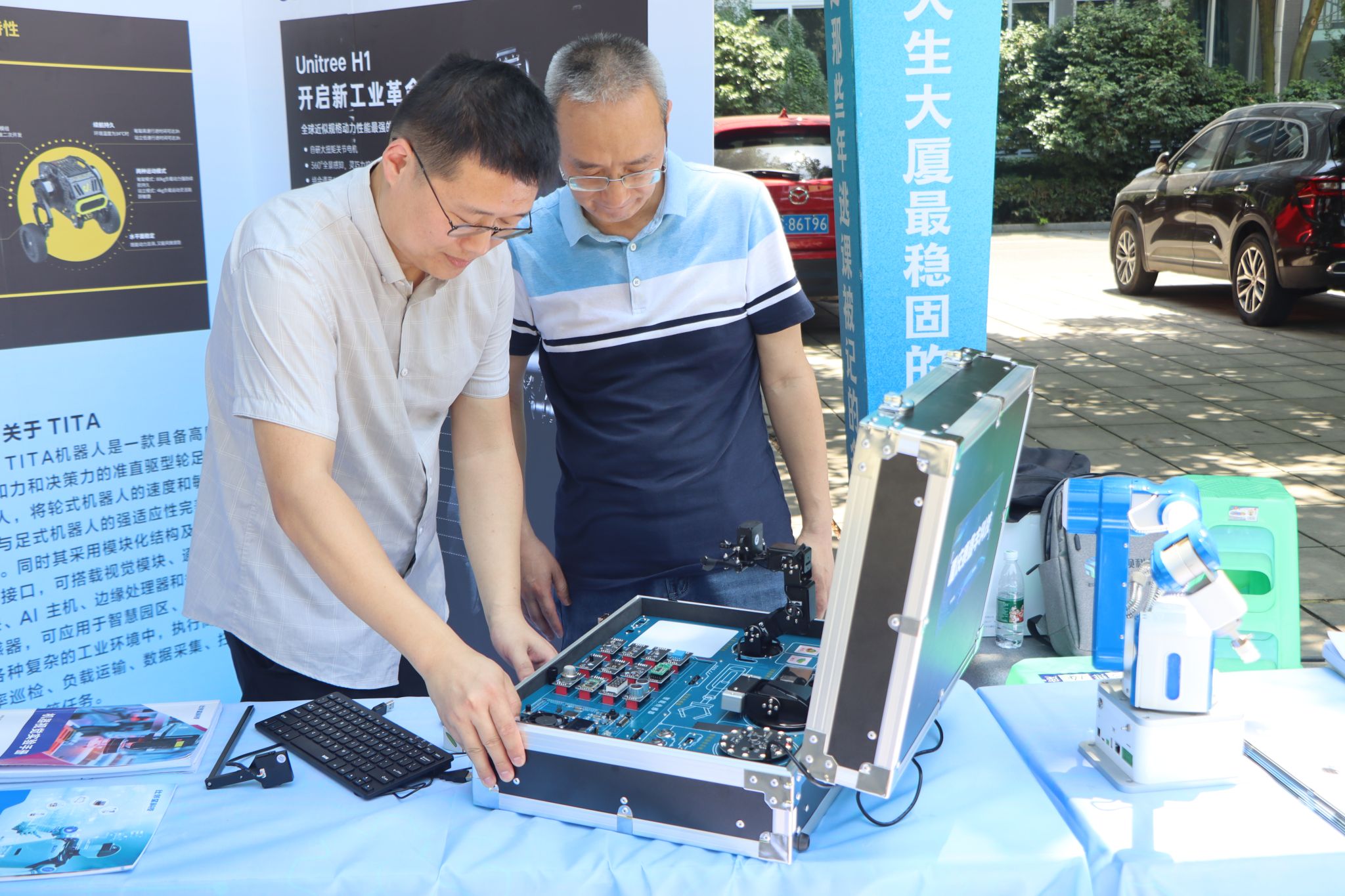 泰鑫丰科技公司带来的Unitree G1人形机器人和Unitree Go2四足机器人等前沿展品及学生竞赛成果成为全场焦点。Unitree G1人形机器人凭借先进的姿态控制算法和多关节协同系统,以流畅的仿生动作与观众亲切握手,展现出科技的细腻与温度;Unitree Go2四足机器人则灵活穿梭于障碍物之间,时而打滚卖萌,时而摇尾示好,其毫秒级地形识别能力充分彰显了运动控制技术与人工智能算法的完美融合。在互动体验环节,泰鑫丰技术专家化身职业导师,带领学生开展沉浸式实践教学。学生们在专家指导下亲手操作机器人设备,调试传感器,模拟真实工作场景。“从参数讲解到实际操作,这次体验让我对人工智能工程师这个职业有了更直观的认识!”24级通信工程卓越9班廖洁龙同学兴奋地分享道。