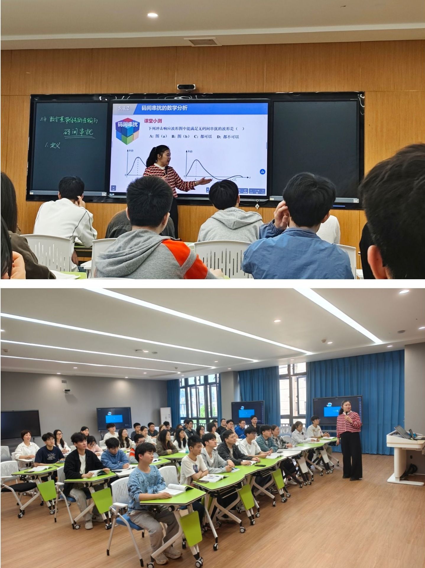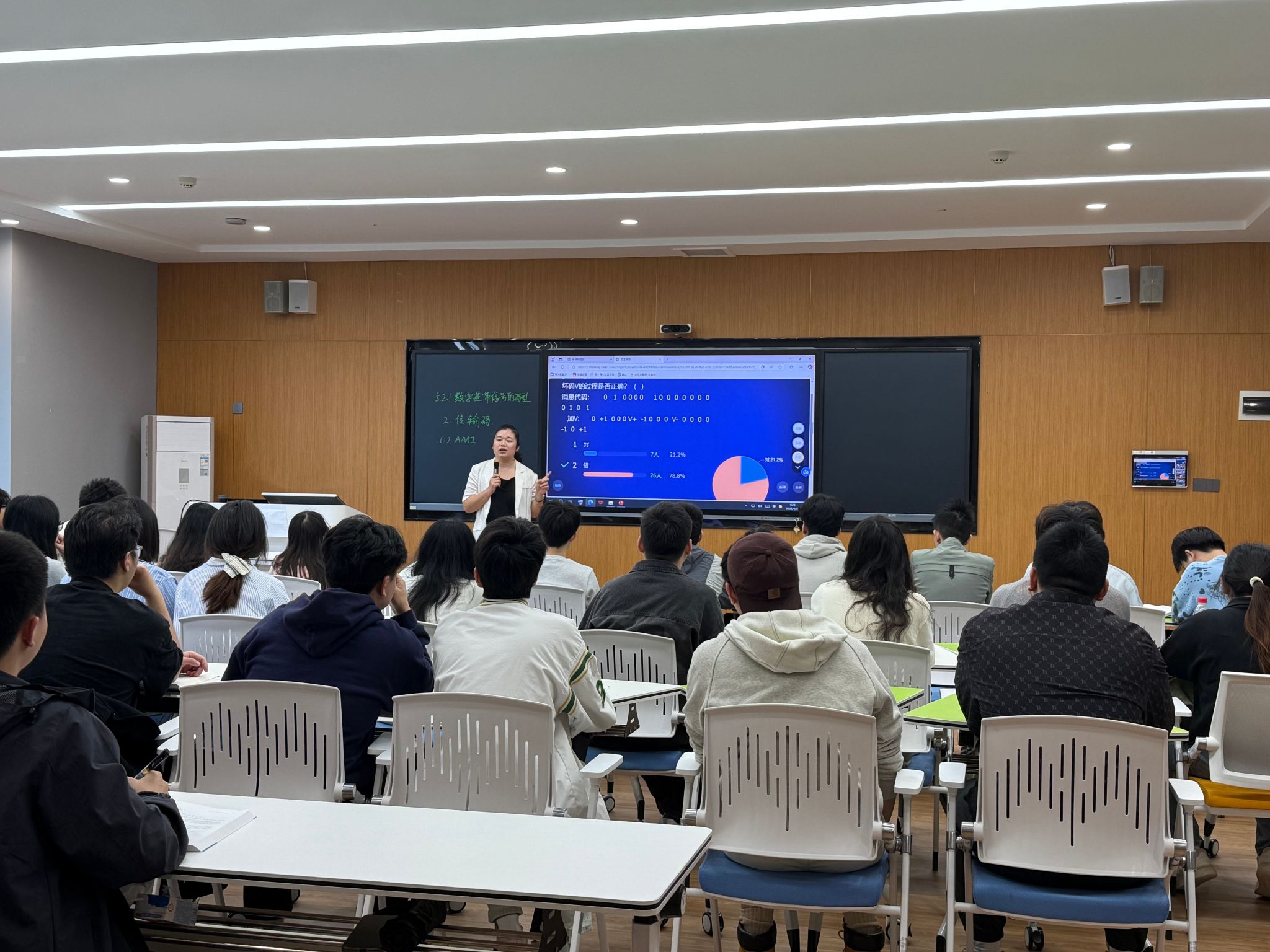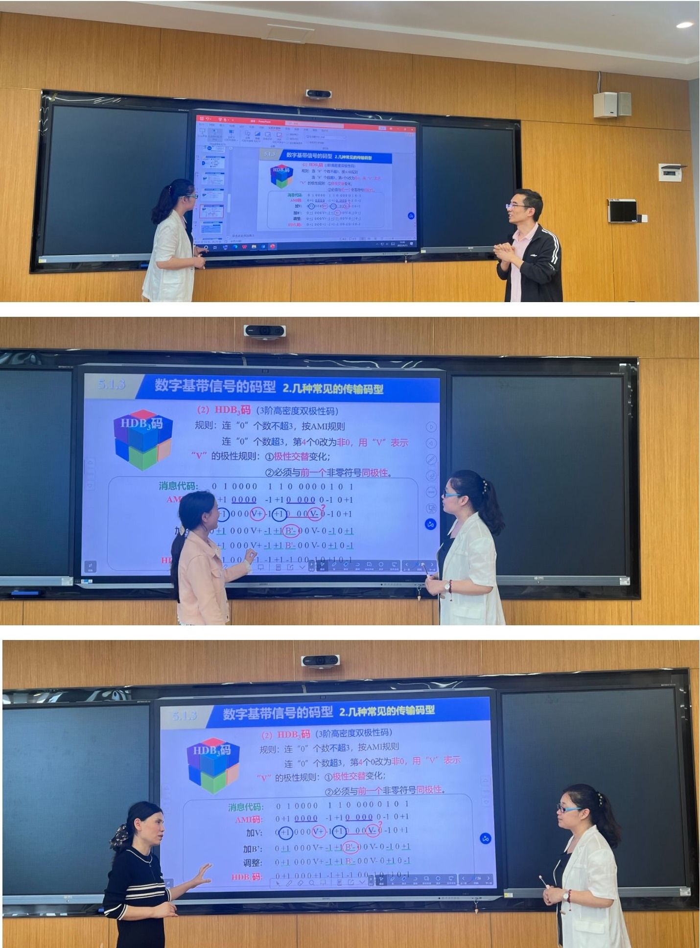 4 月 23 日,王宝珠老师在天空 302 教室开展 “数字基带信号的常见传输码型” 磨课。王宝珠老师借助精心设计的 PPT 动画,生动形象地演示了编码规则,并结合学习通平台实时发布练习题,实现了 “讲解-练习-反馈” 一体化教学。同时,王老师结合我国通信技术自主创新案例,自然地融入课程思政,引导学生树立科技报国的意识。教研室主任以及部分教研室老师参与了此次磨课活动。