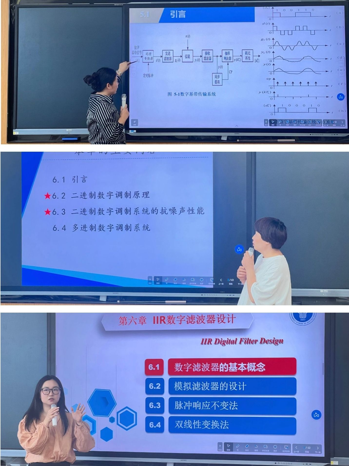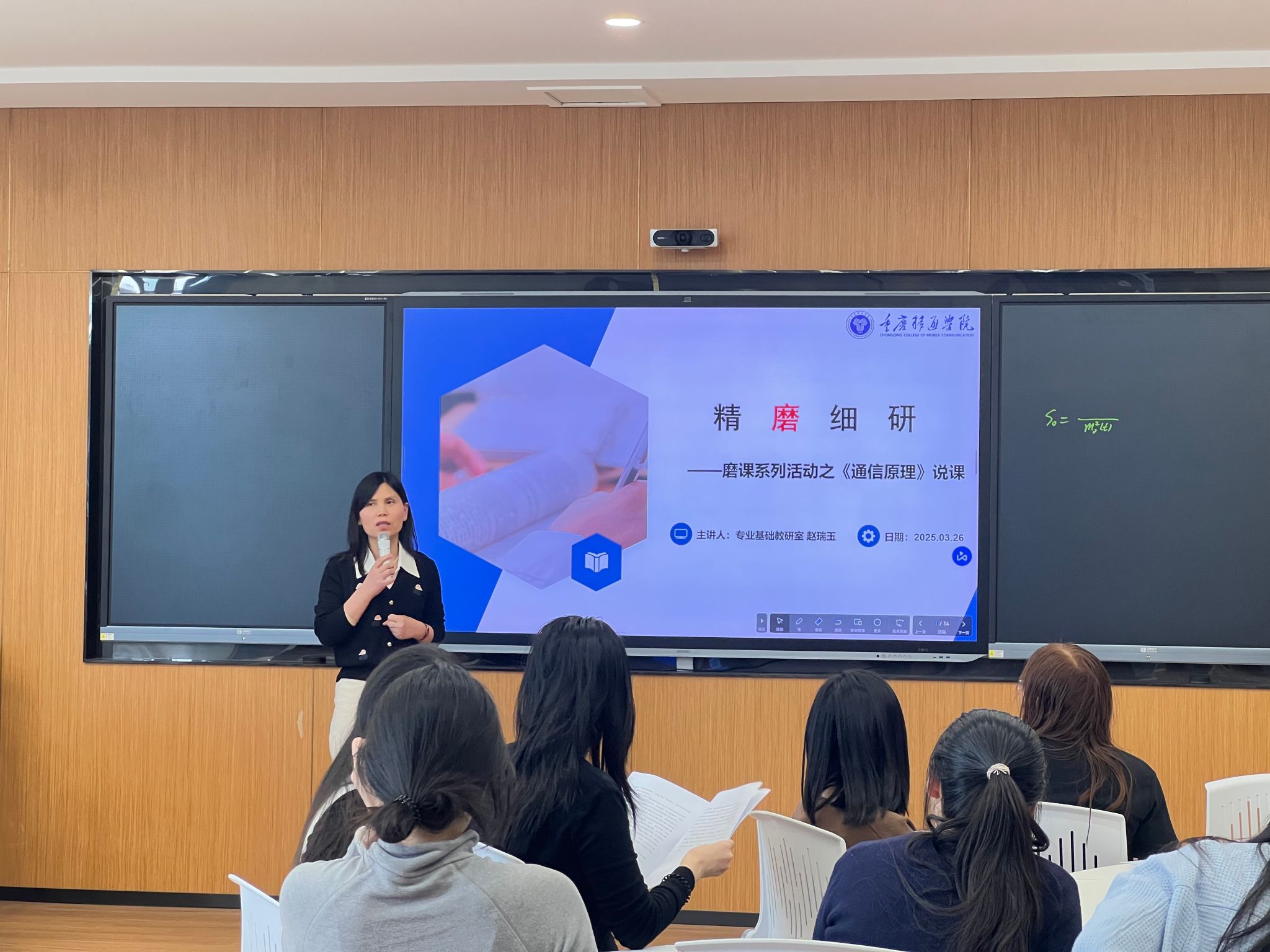 4 月 9 日,教研室组织了第一轮试讲活动,此次活动在教研室内部开展。王宝珠、谌丽、吴萍三位老师分别围绕《通信原理》《数字信号处理》课程的核心内容进行试讲。王宝珠老师在 “数字基带信号传输码型” 的试讲中,系统地梳理了从编码规则、实例分析、优缺点对比到工程应用的知识框架,并巧妙地融入课程思政元素,引导学生在学习技术原理的同时,感悟通信技术发展中的工匠精神。谌丽老师则结合《通信原理》的难点内容,通过类比生活实例,将抽象概念变得通俗易懂,有效强化了学生对理论知识的理解。吴萍老师在《数字信号处理》的试讲中,借助 MATLAB 仿真工具,直观演示信号处理过程,突出了课程的实践性与应用性。