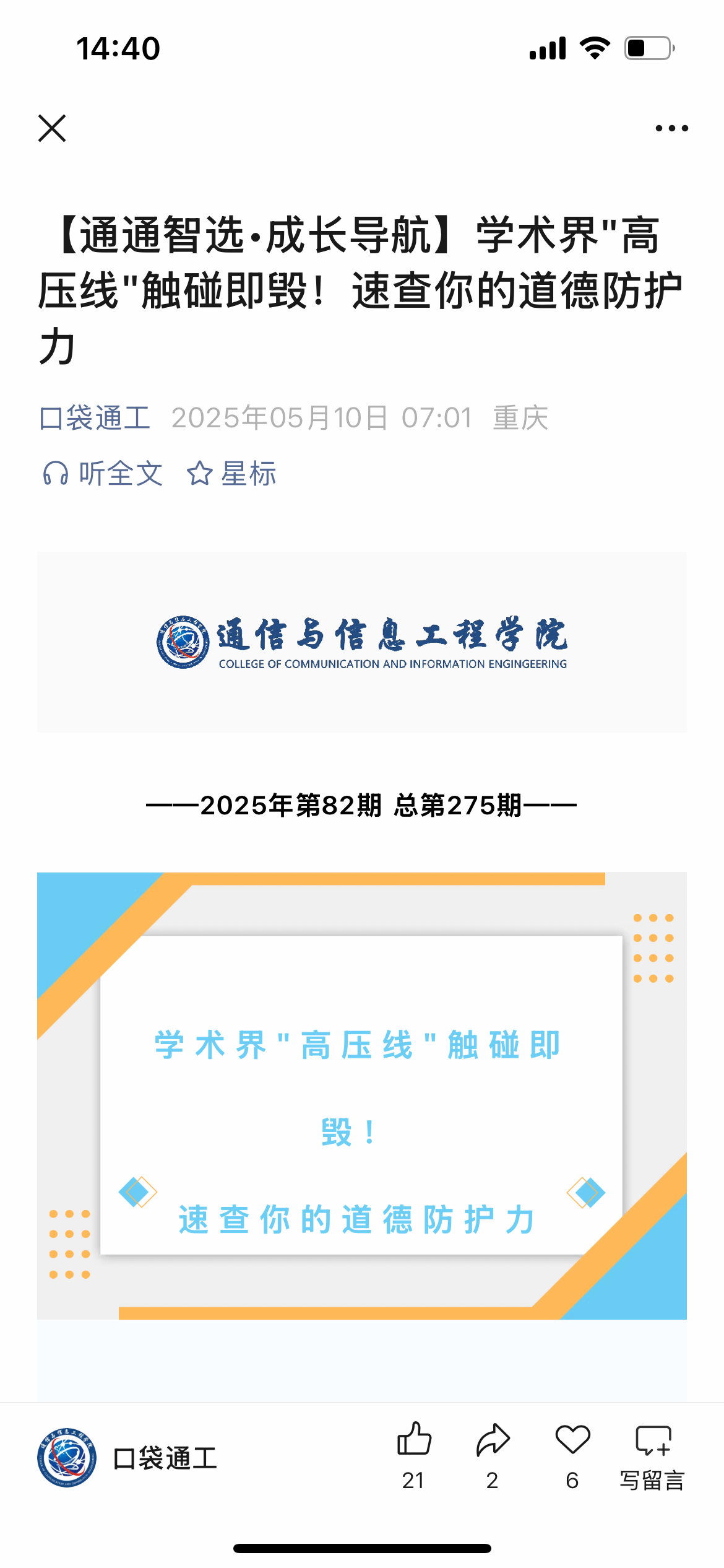 活动初期,学院充分利用新媒体平台的传播优势,在官方公众号上精心策划并发布了一系列学术道德主题推文。这些推文内容丰富多样,不仅涵盖了学术道德的基本准则、重要意义,以生动形象的语言和图文并茂的形式,向全院师生直观地展示了学术不端行为带来的严重后果,为后续活动的开展奠定了良好的思想基础。