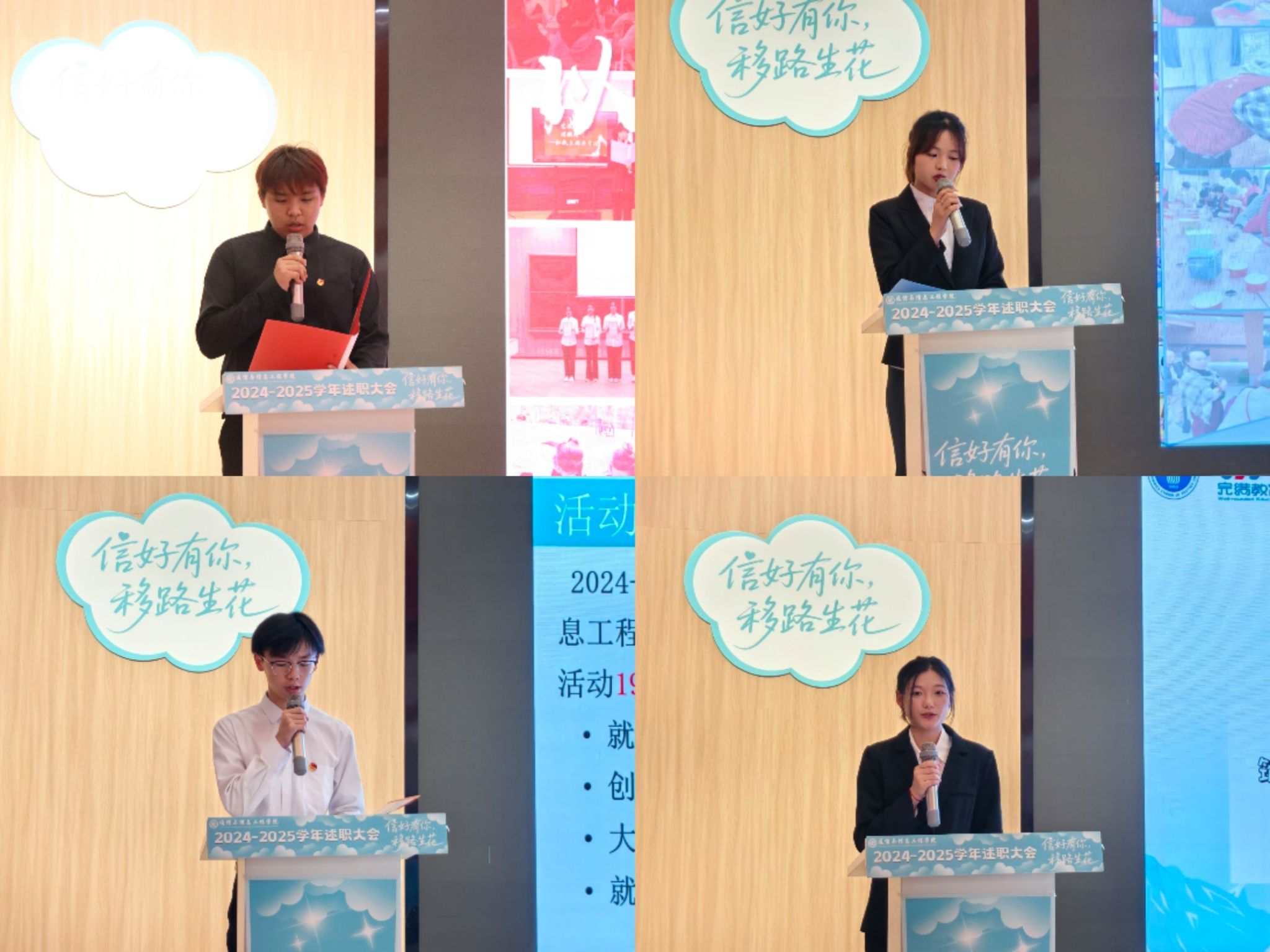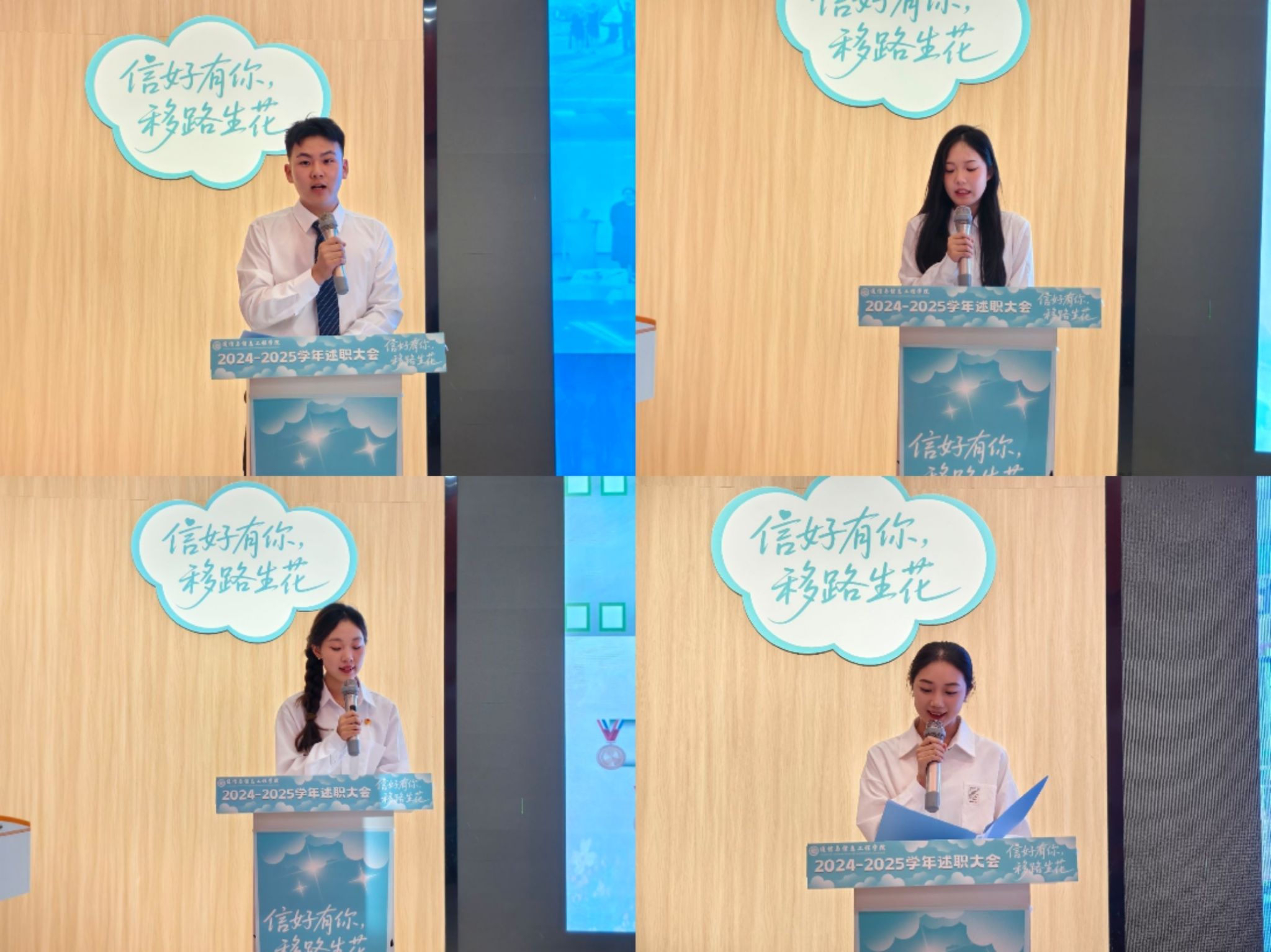 活动伊始,组织部、青年志愿者协会、就业助理团等9个学生组织代表依次登台,通过PPT与短视频相结合的形式,从组织建设、活动成果、反思提升三个维度进行述职汇报。体育协会以“聚力凝心,谱写运动新片”为主题,通过各类图片生动呈现了爱跑者、铁人三项等5项品牌活动;青年志愿者协会则以“1000余小时志愿服务时长”的亮眼数据,诠释了通信学子的社会责任与使命担当。