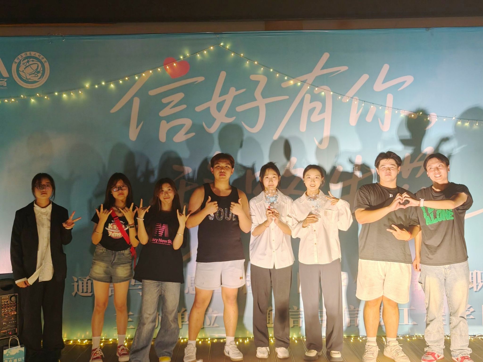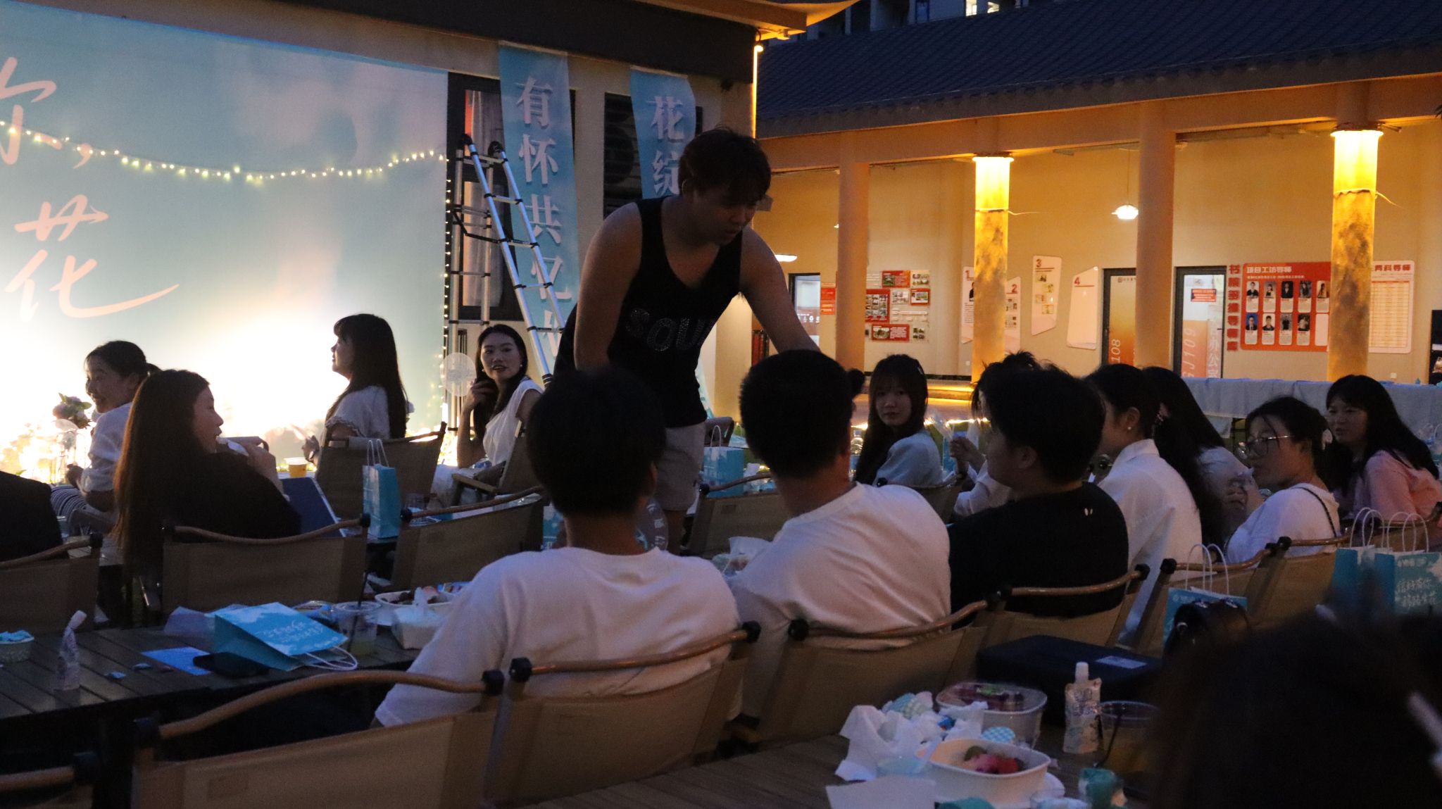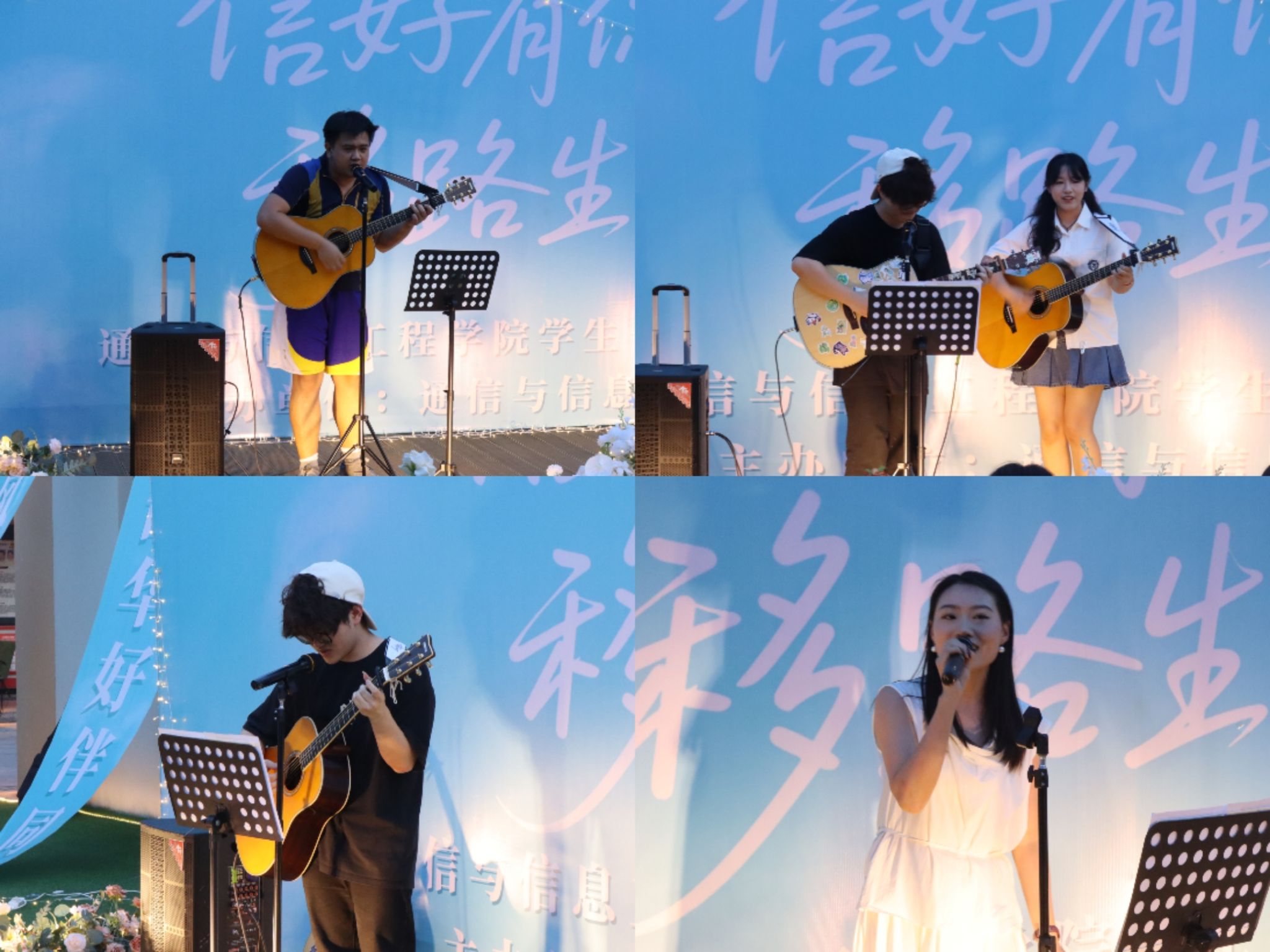 交流会于晚上7点正式拉开帷幕,主持人赖枫灵以热情洋溢的开场白点燃现场氛围。随后,吉他社成员用动人的旋律为现场增添了一抹文艺色彩。崔启威同学率先登场,以一首《活着》展现精湛的吉他技艺;李支圆与秦雨馨合唱的《等你下课》引发全场共鸣;李支圆独唱的《瘦子》更是将气氛推向高潮。老师们和同学们也纷纷展示才艺为晚会助兴。同学们手持扇子随节奏摇摆,为离别前夕的夜晚留下难忘的音乐记忆。