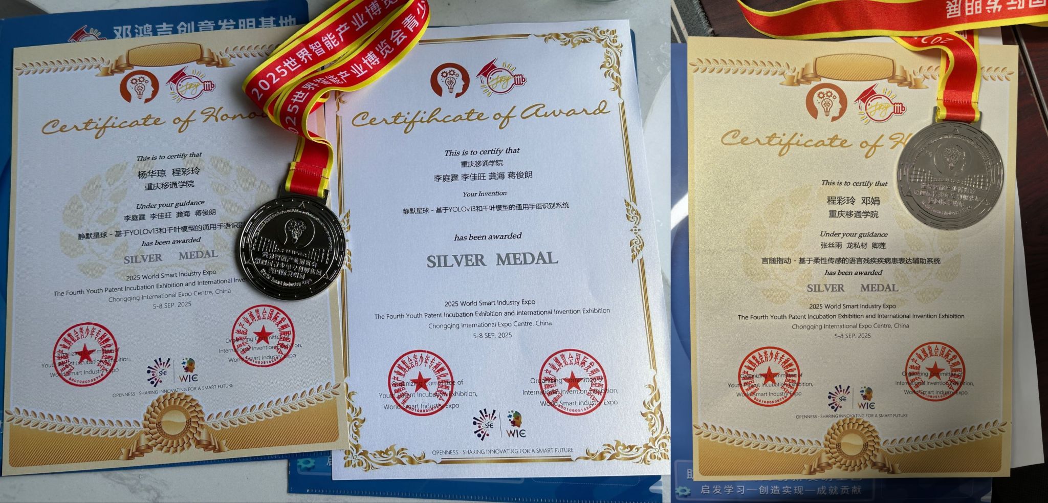 9月5日,2025世界智能产业博览会(智博会)在重庆国际博览中心召开,同期举办智博会第四届青少年专利孵化展暨国际发明展。通信与信息工程学院学生专利作品“言随指动—基于柔性传感的语言残疾病患表达辅助系统”及“静默星球—基于YOLOv13和千叶模型的通用手语识别系统”,在通信与信息工程学院及淬炼商学院老师联合指导下,不仅经过组委会严格筛选顺利参展,更在展品评审活动中双双斩获银奖。