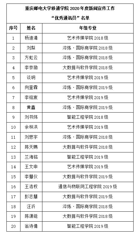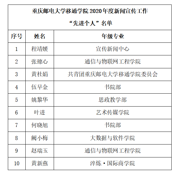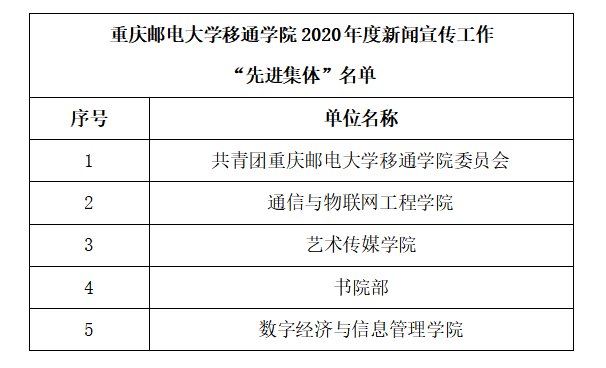 为激发我校新闻宣传工作人员的积极性,促进我校新闻宣传工作再上新台阶,根据《重庆邮电大学移通学院2020年度“校园十大新闻事件”和新闻宣传工作先进集体、先进个人评选标准》,经各单位、个人自主申报、宣传阵地评委组初审及领导终审后,最终评选出2020年度新闻宣传工作先进集体5个、先进个人10名、优秀通讯员20名,现予以公示。公示期为2020年12月29日-12月30日。