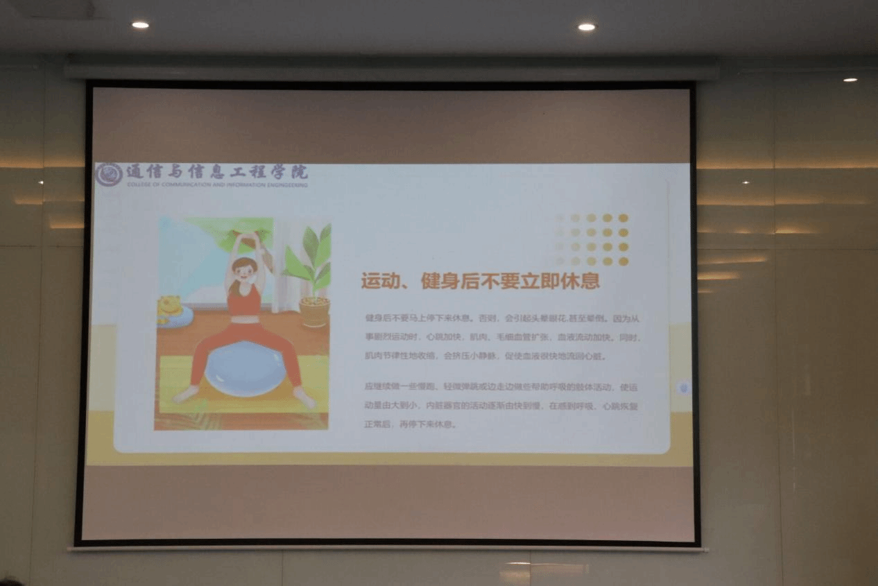 村上春树在关于身材管理方面有一句名言:“肉体才是每个人的神殿,不管里面供奉的是什么,都应该好好保持它的强韧、美丽和清洁。”活动中期,PPT上向学生们展示了运动、健身后不要立即休息,因为从事剧烈运动时,心跳会加快,肌肉节律性地收缩,从而促使血液很快的流回心脏。应做一些能帮助呼吸的肢体活动,使运动由大到小,在感到呼吸、心跳恢复正常后再停下休息。