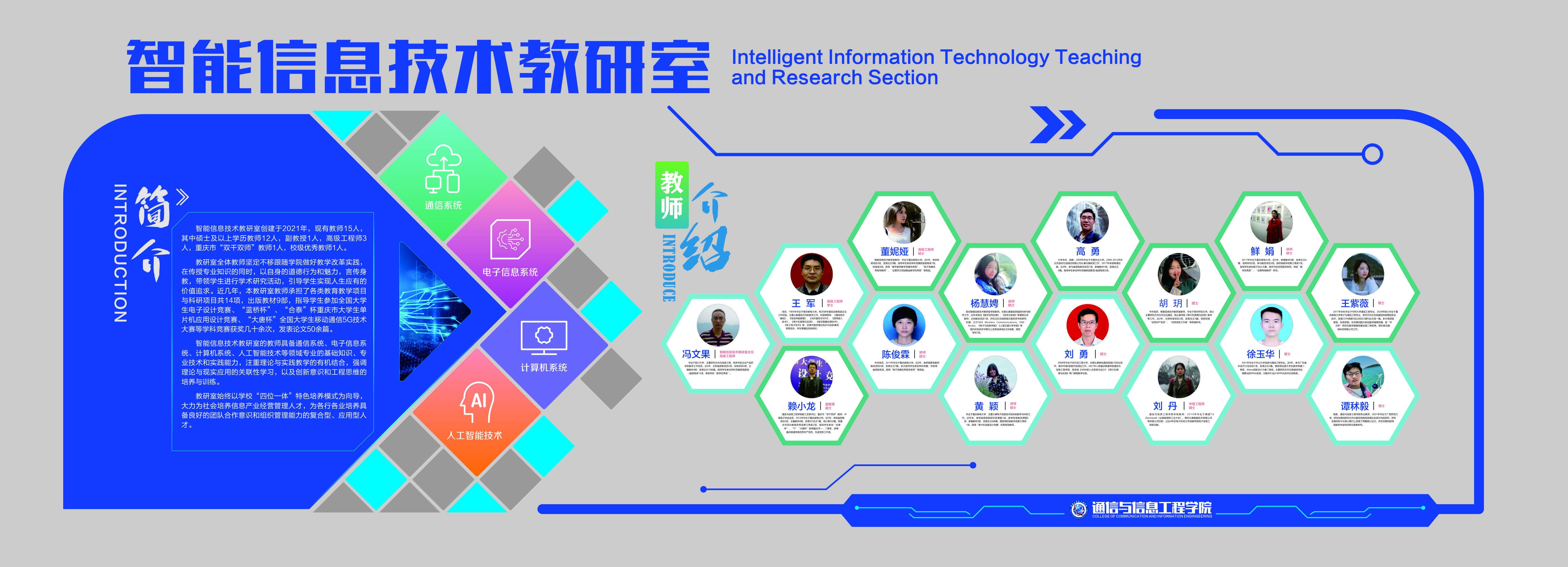 智能信息技术教研室创建于2021年,现有教师11人,其中硕士及以上学历教师8人,副教授1人,高级工程师3人,重庆市“双千双师”教师1人,校级优秀教师1人。