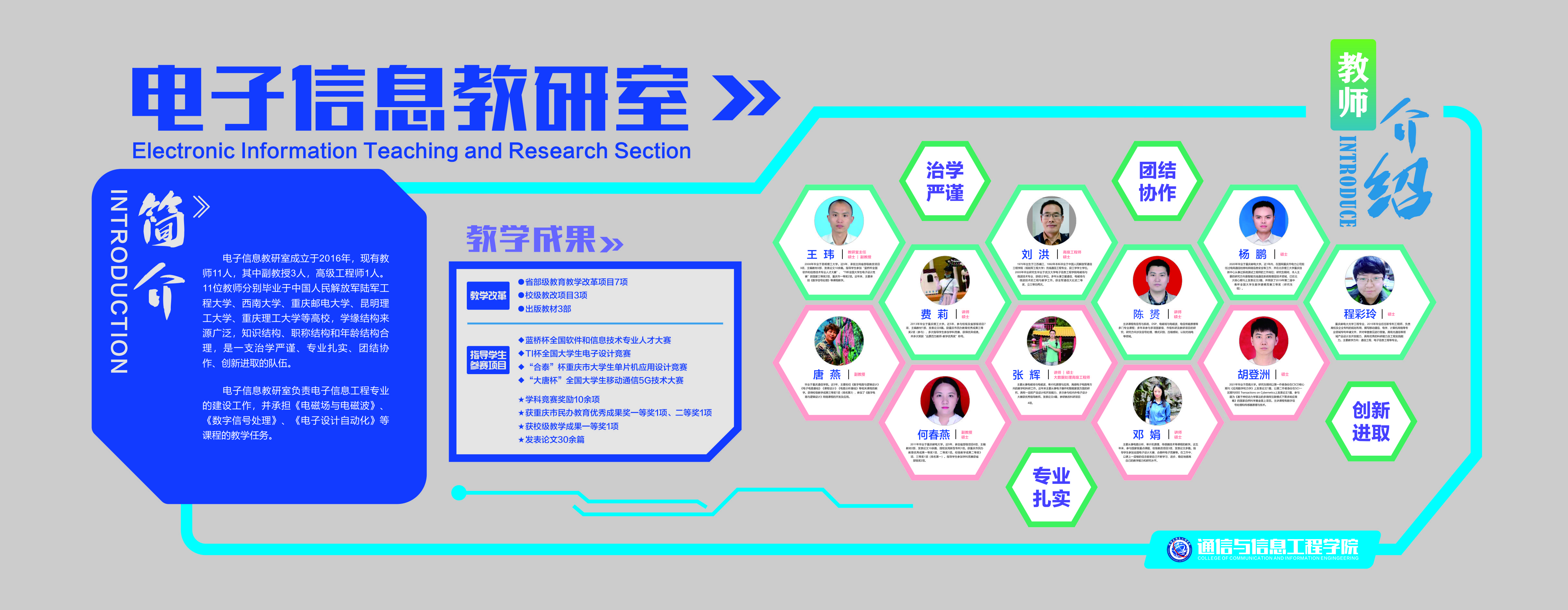 电子信息教研室成立于2016年,现有教师11人,其中副教授4人,高级工程师1人。11位教师分别毕业于中国人民解放军陆军工程大学、西南大学、重庆邮电大学、昆明理工大学、重庆理工大学等高校,学缘结构来源广泛,知识结构、职称结构和年龄结构合理,是一支治学严谨、专业扎实、团结协作、创新进取的队伍。