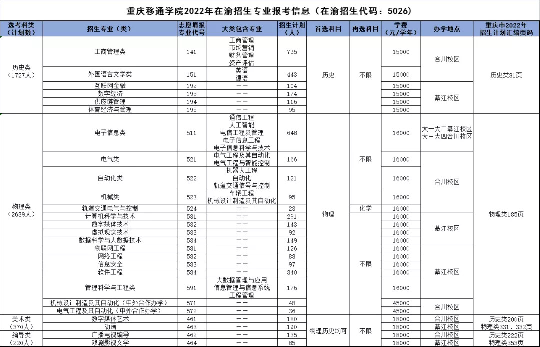 2022年,重庆移通学院在渝招生计划4956名,其中重庆物理类招生计划2639名,重庆历史类招生计划1727名,重庆美术类招生计划370名,重庆编导类招生计划220名。