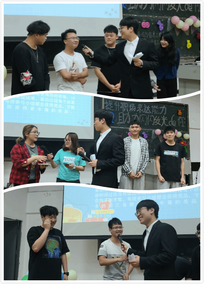 为了让我们在职场面试时,更好地应对面试官提问,提升语言表达能力,年级会准备了一个小游戏“添文加字”。规则是每个班推选五位同学组队站成一排,每个同学在前一个同学说的词后添加一个字,使其构成不能矛盾的一句话。不难看出,每组同学或多或少都会出现一些卡顿,逻辑表达混乱,因为紧张而说不出话的情况,但从他们积极参加游戏的态度中流露出他们渴望改变自己的强烈愿望。这个小游戏不但考查了同学们的词汇积量,还锻炼了同学们的逻辑表达和语言组织能力。同学们在游戏当中不知不觉就锻炼了自己的语言表达能力,也让同学们了解到了职场当中语言表达的重要性。