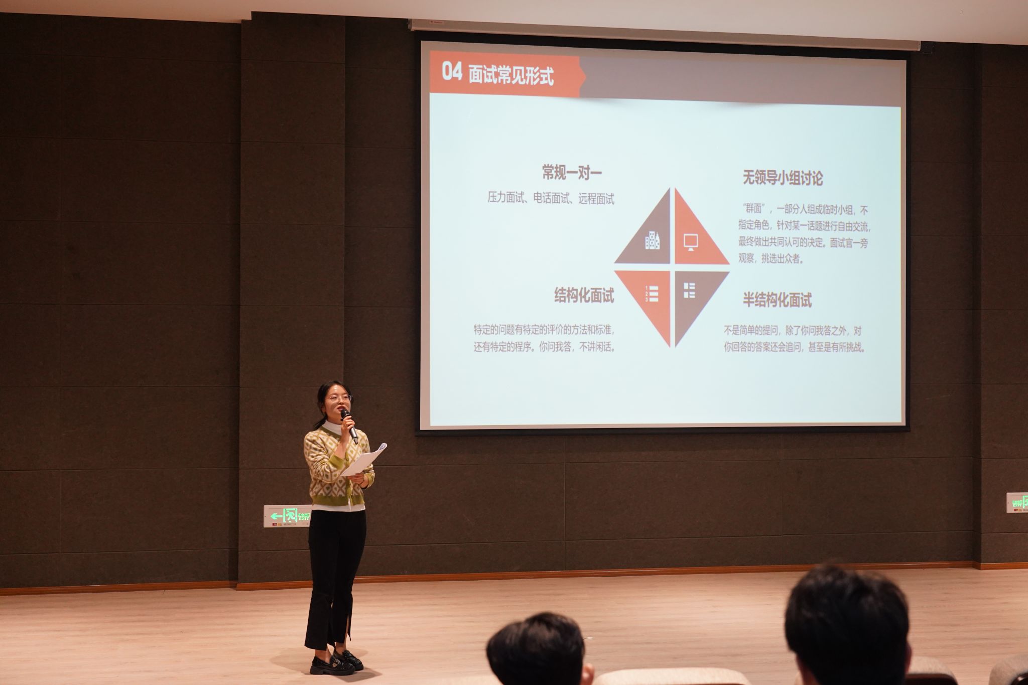 活动伊始,辅导员老师们首先强调了在当前复杂多变的就业市场中,提前准备、精准定位的重要性。关键在于“面试不仅是对专业知识的检验,更是对个人综合素质、沟通能力和应变能力的全面考察。” 辅导员老师讲解了面试类型,面试题型,以及面试需要做的准备。
