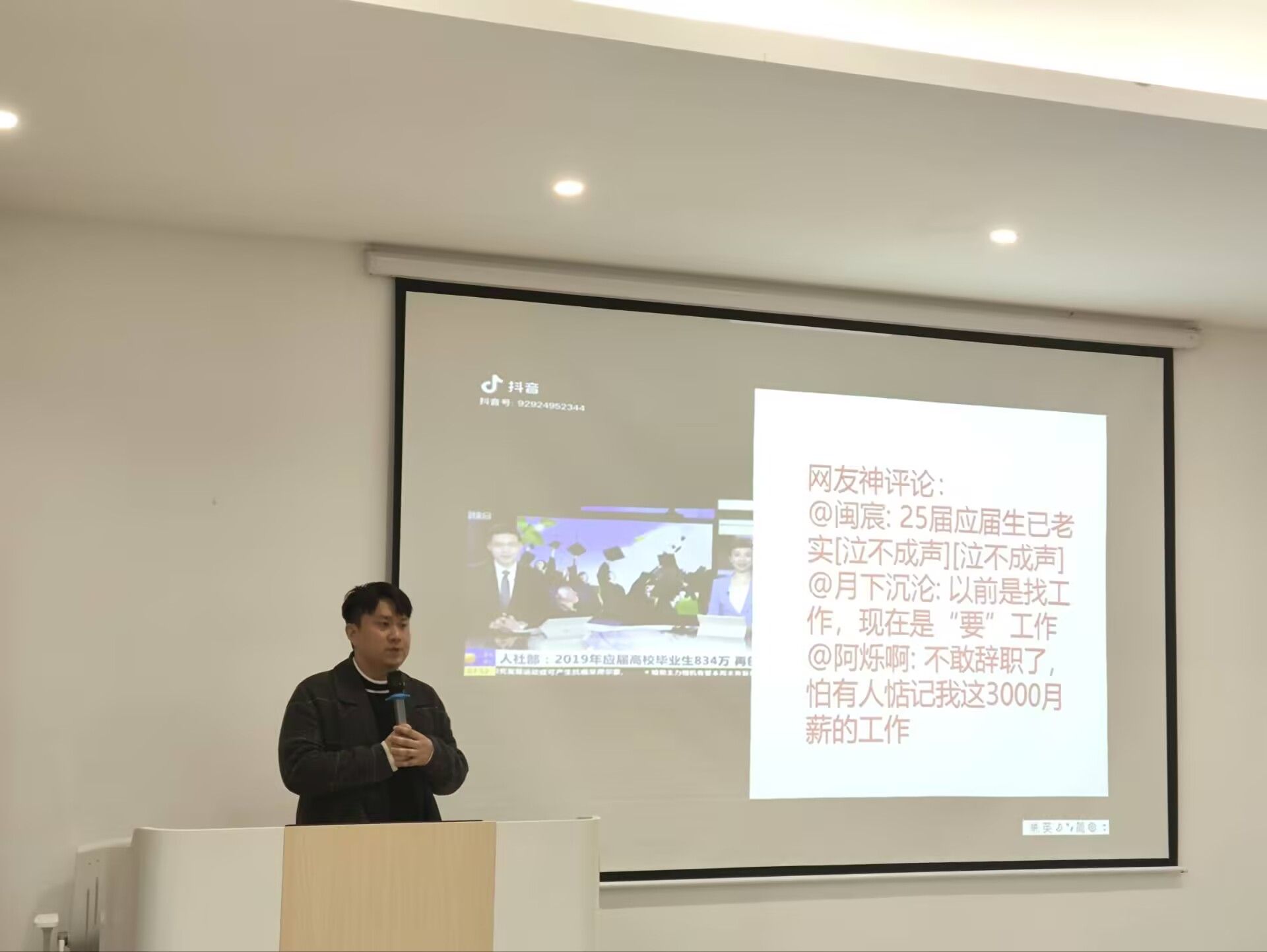 活动伊始,罗老师用一组历年大学生毕业人数的对比数据开场。从早期的几十万到如今的逐年攀升,这直观反映出就业竞争的激烈程度。罗老师借此指出,在当下职场环境中,高效展示自我价值是生涯规划的关键,同学们不能被动等待,而要主动出击,学会包装与营销自己,这番讲解立刻吸引了现场 80 名同学的注意力。