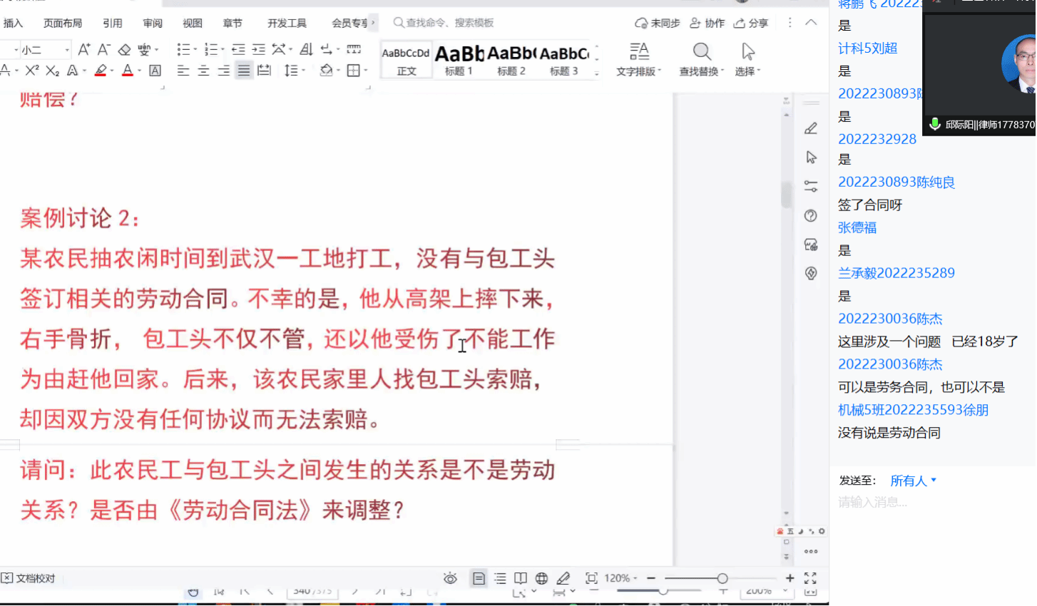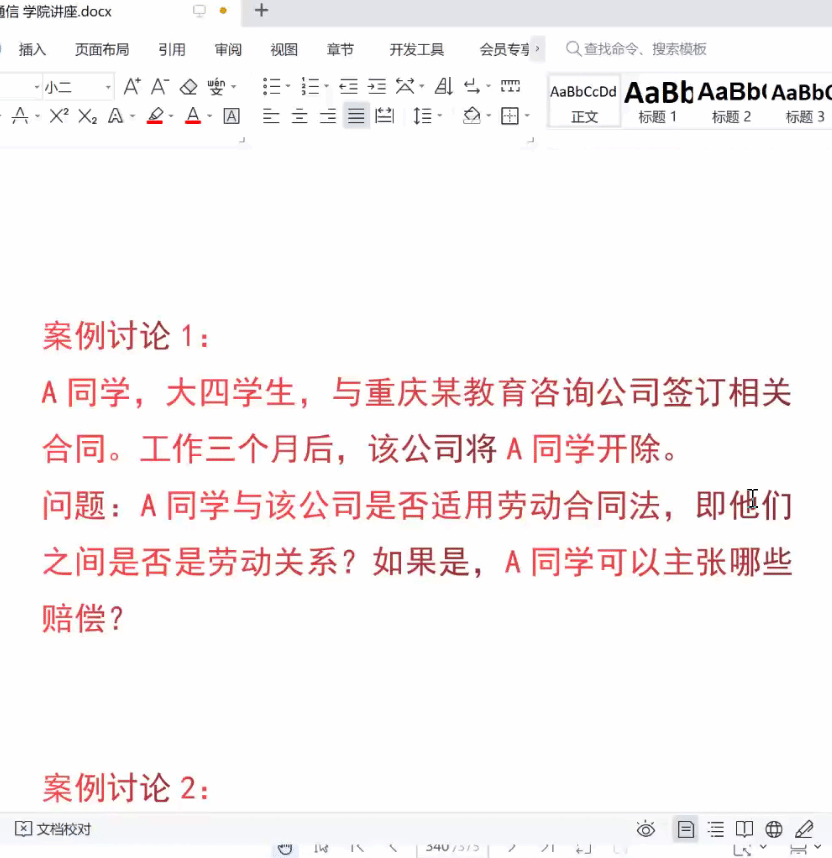 讲座伊始,邱老师通过两个案例讨论引入本次课程,分别是同学们在打暑假工时普遍会遇到的与教育机构的合同问题以及在没有签订劳务合同时的索赔问题。邱老师指出,在工作期间没有出现重大过错时,公司是不能开除员工并且按照劳动合同法不足一年按一个月的工资进行补偿。而案例二中《劳动合同法》则是对弱势群体的一种保护。