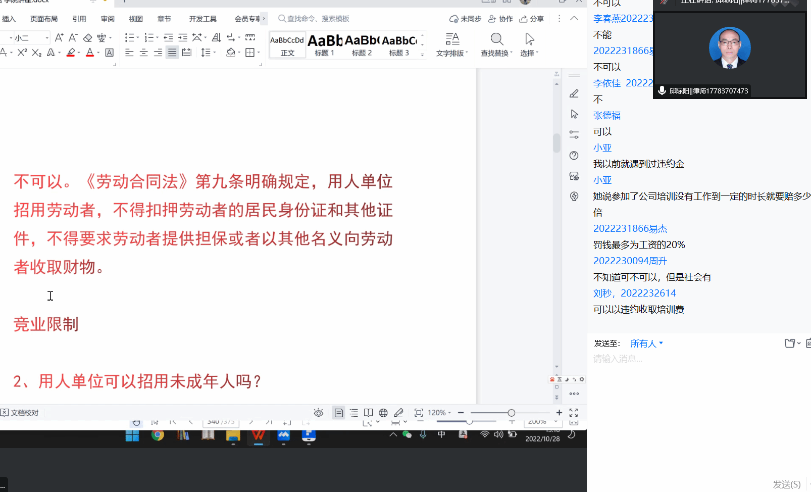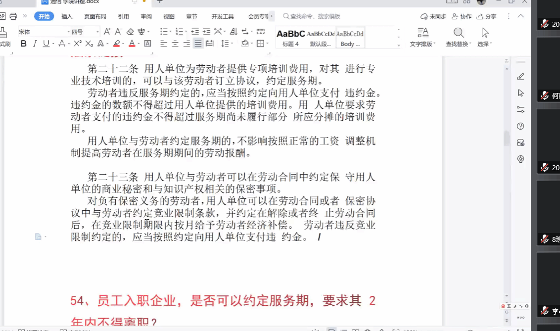 然后邱老师提出了两个关键词,分别是“竞业限制”和“商业秘密”。竞业限制指用人单位和知悉本单位商业秘密或者其他对本单位经营有重大影响的劳动者在终止或解除劳动合同后的一定期限内不得在同类型或有其他竞争关系的用人单位任职,也不得自己生产与原单位有竞争关系的同类产品或经营同类业务。限制时间由当事人事先约定,但不得超过二年。所以当我们从上任公司离职时公司以此威胁我们,我们亦可进行合法维权。