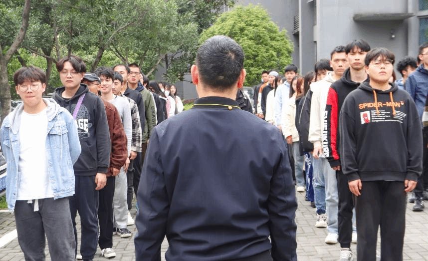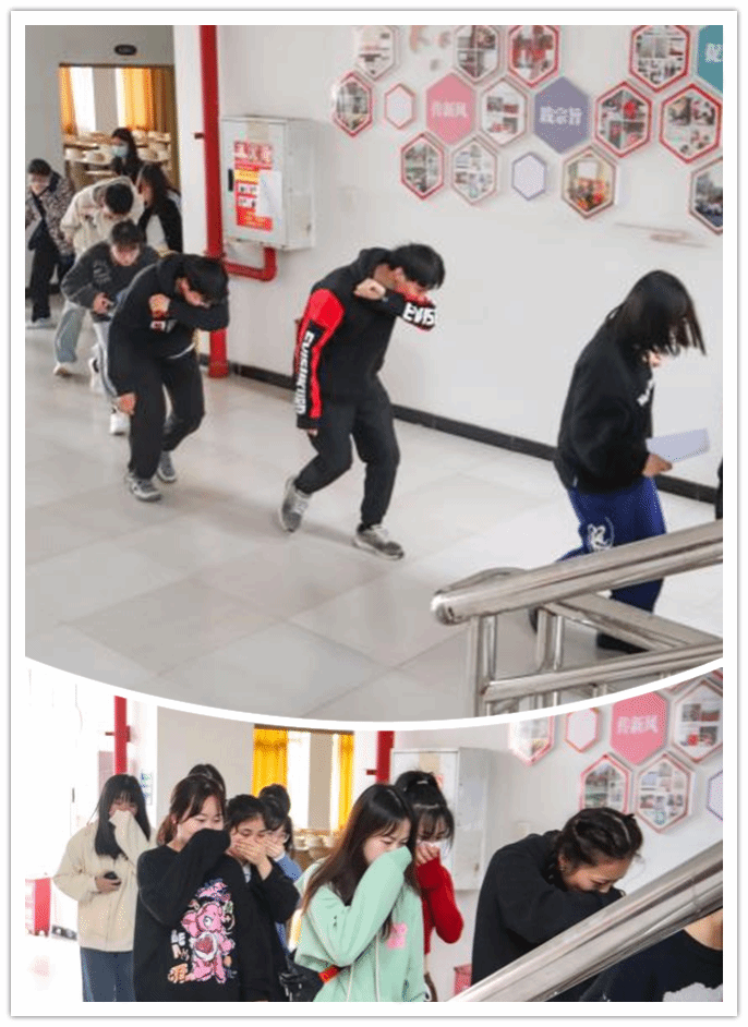 随着老师的口哨吹响,演习正式开始。同学们在彭洪处长组织下,捂住口鼻,躬下身子,迅速进入紧急疏散状态。拍成一列纵队,分别从前后两个教室门迅速跑出,按照提前规划好的逃生路线依次撤离到教学楼下空旷的停车场处,成四路纵队迅速站好。