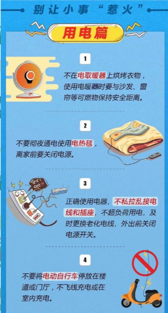 1.居家使用电器设备,不超负荷用电,如电暖器、空调等大功率电器避免同时使用。定期检查电器线路,发现老化、破损及时更换。