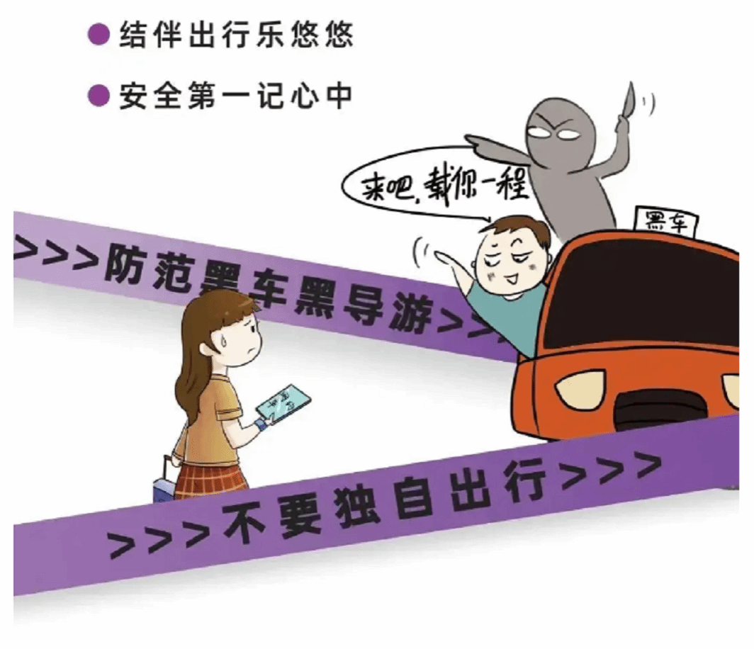 2.独自或结伴外出,提前告知父母长辈,在外注意安全,不轻易相信陌生人,手机电话等通讯工具保持畅通,遇到问题及时求助。乘坐长途客车、火车、高铁、飞机等交通工具,务必系好安全带。妥善放置行李,不将贵重物品置于行李架,防止被盗。切勿乘坐非正规平台的私家车辆。