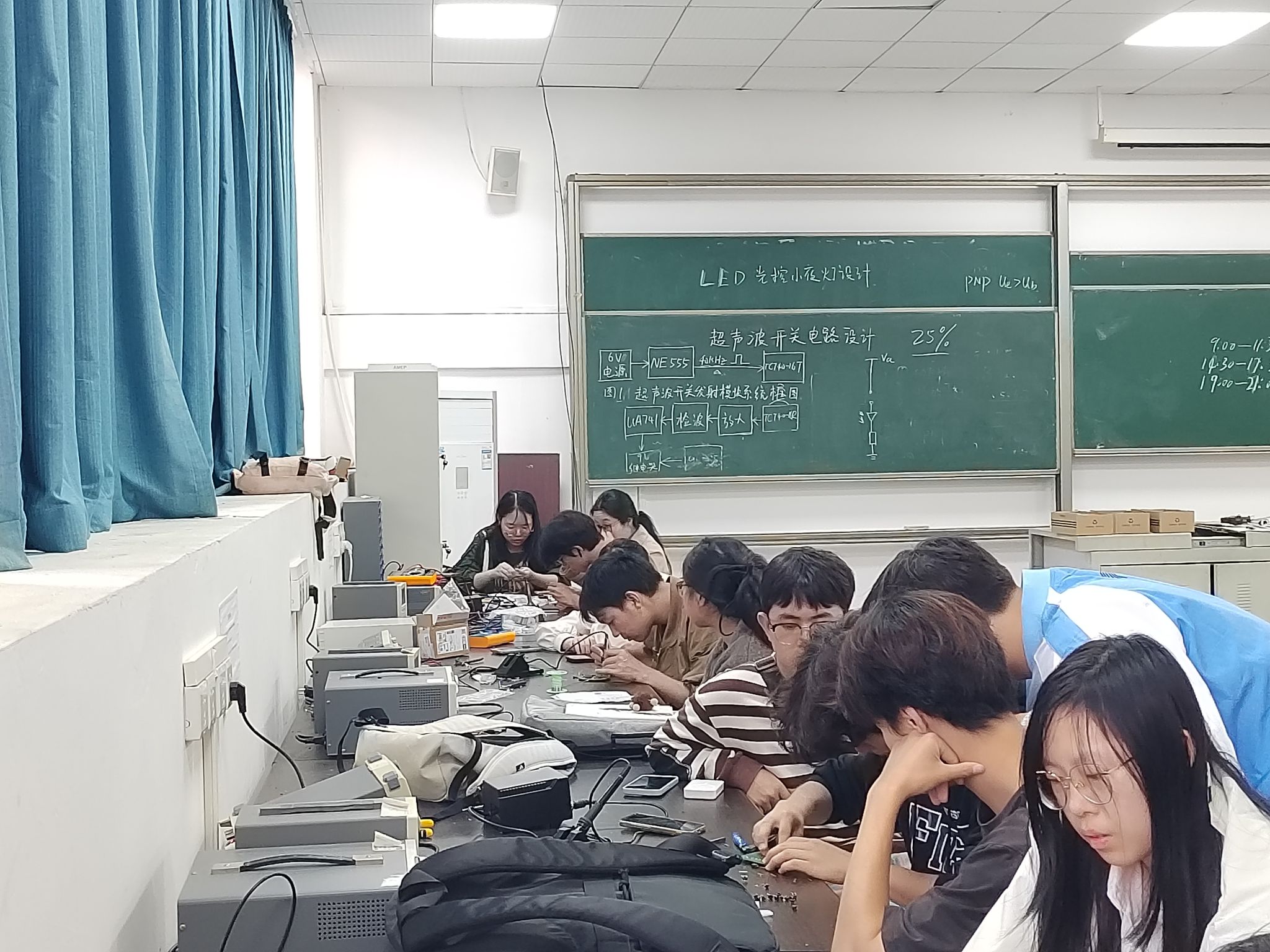 在实验室,指导老师与参赛同学们相互合作,参赛队员们对作品进行密集测试与迭代优化,现场讨论热烈,竞赛有条不紊地进行着。随着作品逐渐成型,赛事相关的在线讨论也持续升温,充分展现了参赛者对电子设计竞赛的高度热情与投入。