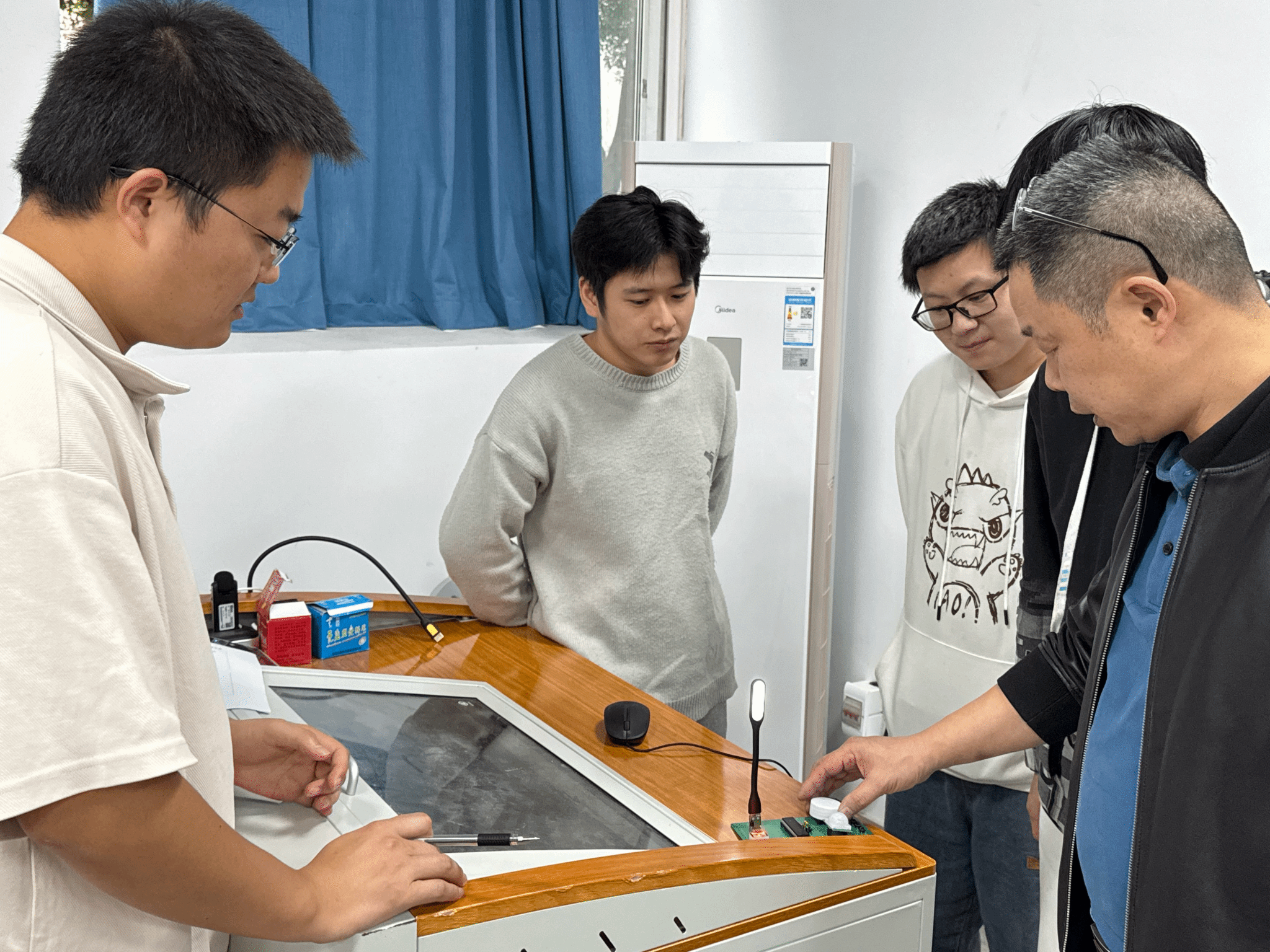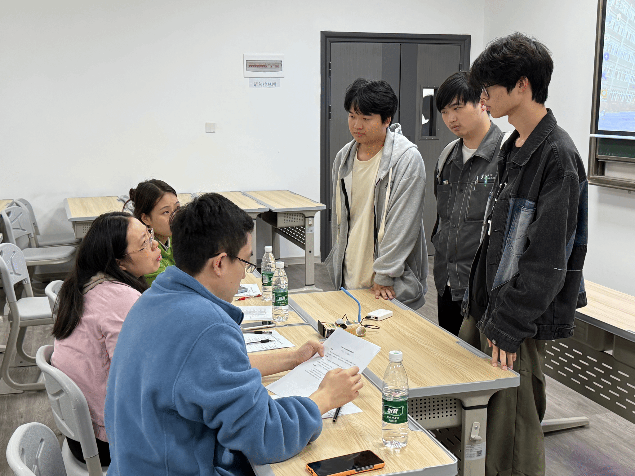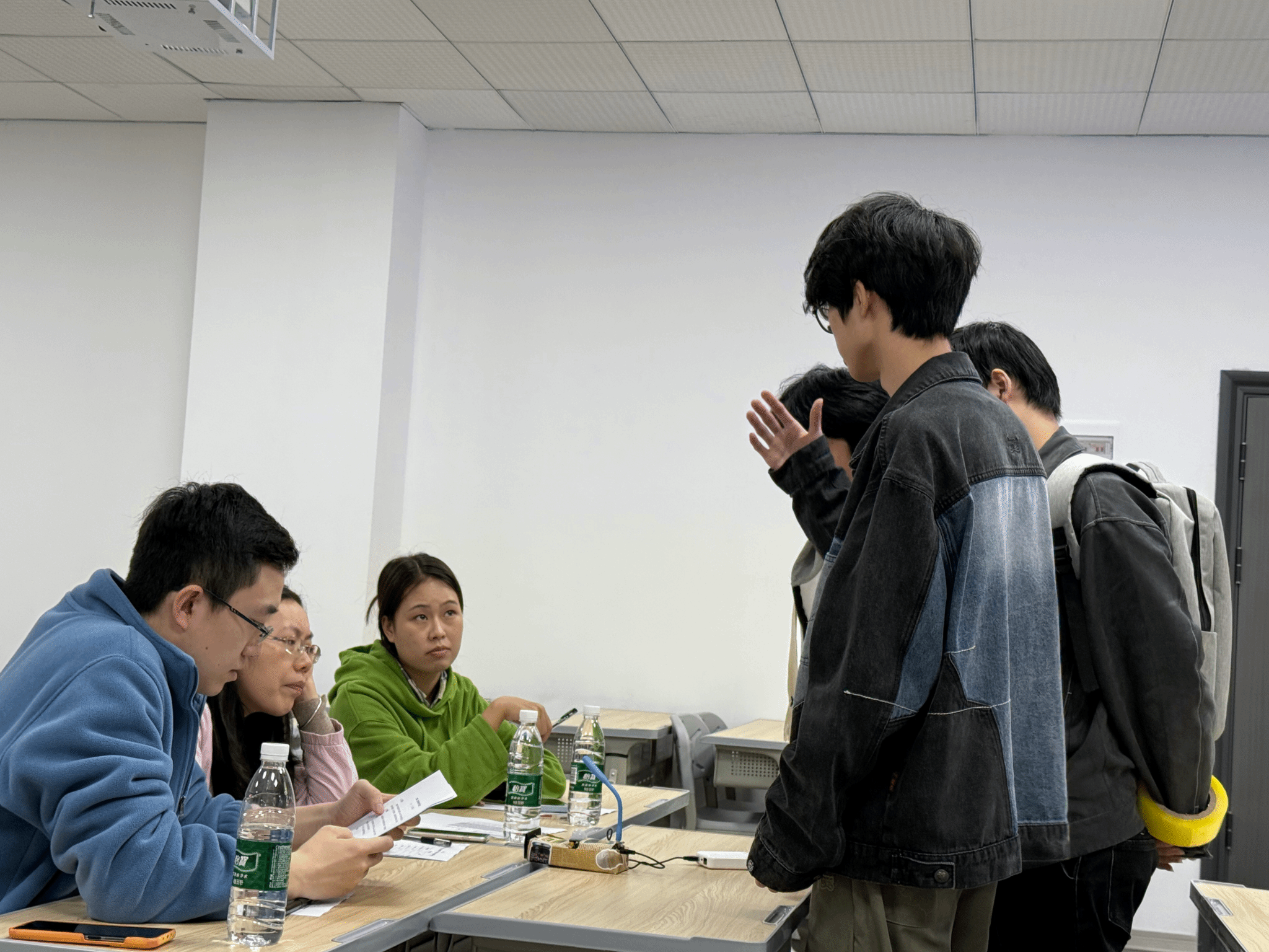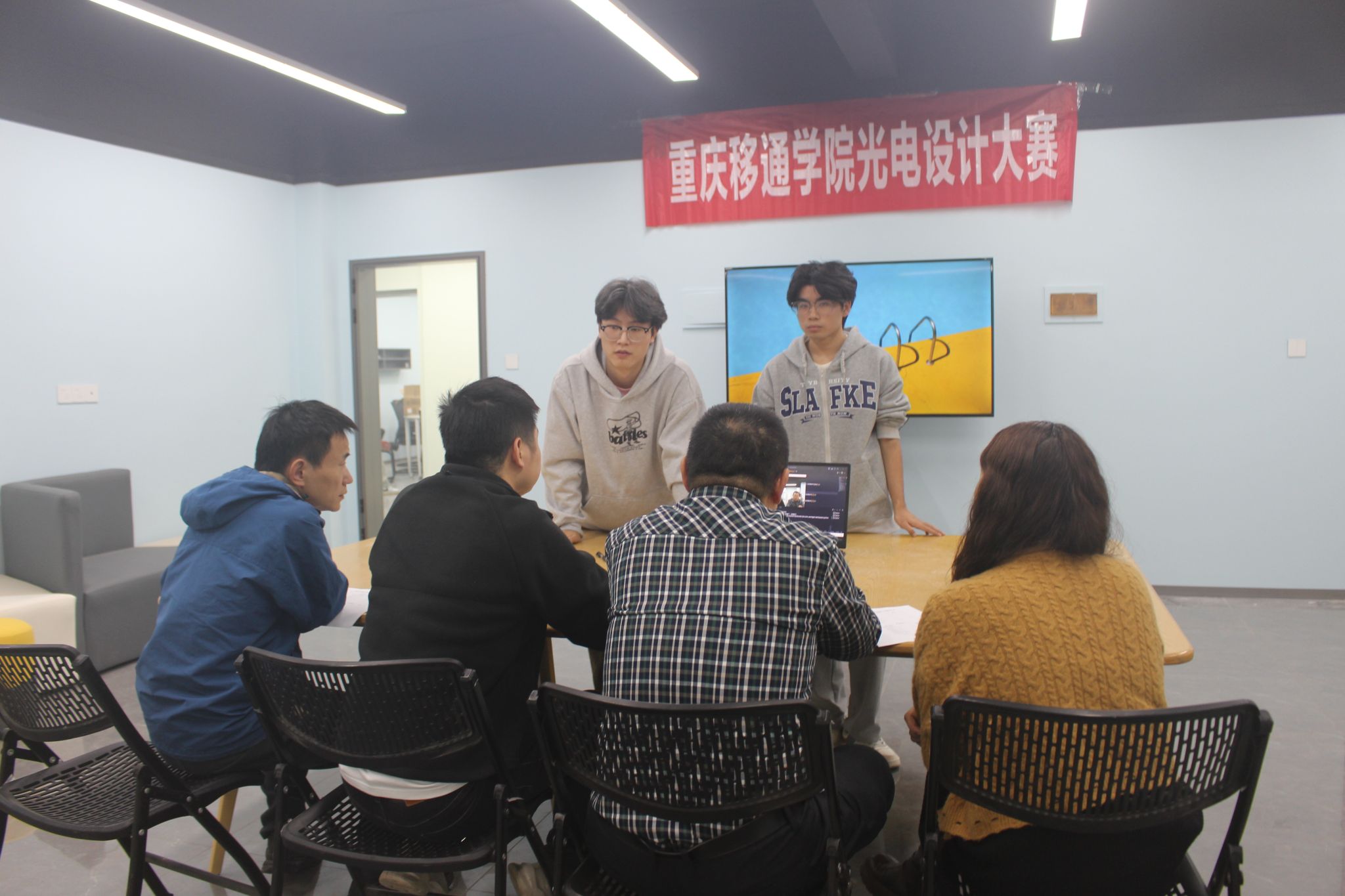答辩环节由通信与信息工程学院陈俊吉老师、高大果老师、高勇老师、郑秋菊老师等12位老师组成评委组。评委组从选手们对参赛作品原理的理解、制作过程、功能实现和现场答辩等方面,公平公正地对答辩选手进行评分。在答辩现场各个队伍依次展现自己完成的作品,从巧妙的电路构思到精准的光学元件应用,每一个细节都彰显了选手们扎实的专业知识和对光电技术的深刻理解。通过“PPT+答辩”的模式,参赛者眼中闪烁着自信的光芒,清晰而流畅地阐述设计思路、技术难点和创新点。评委们认真聆听并针对作品提出一系列专业的问题,选手们沉着应对,展现出了良好的应变能力。