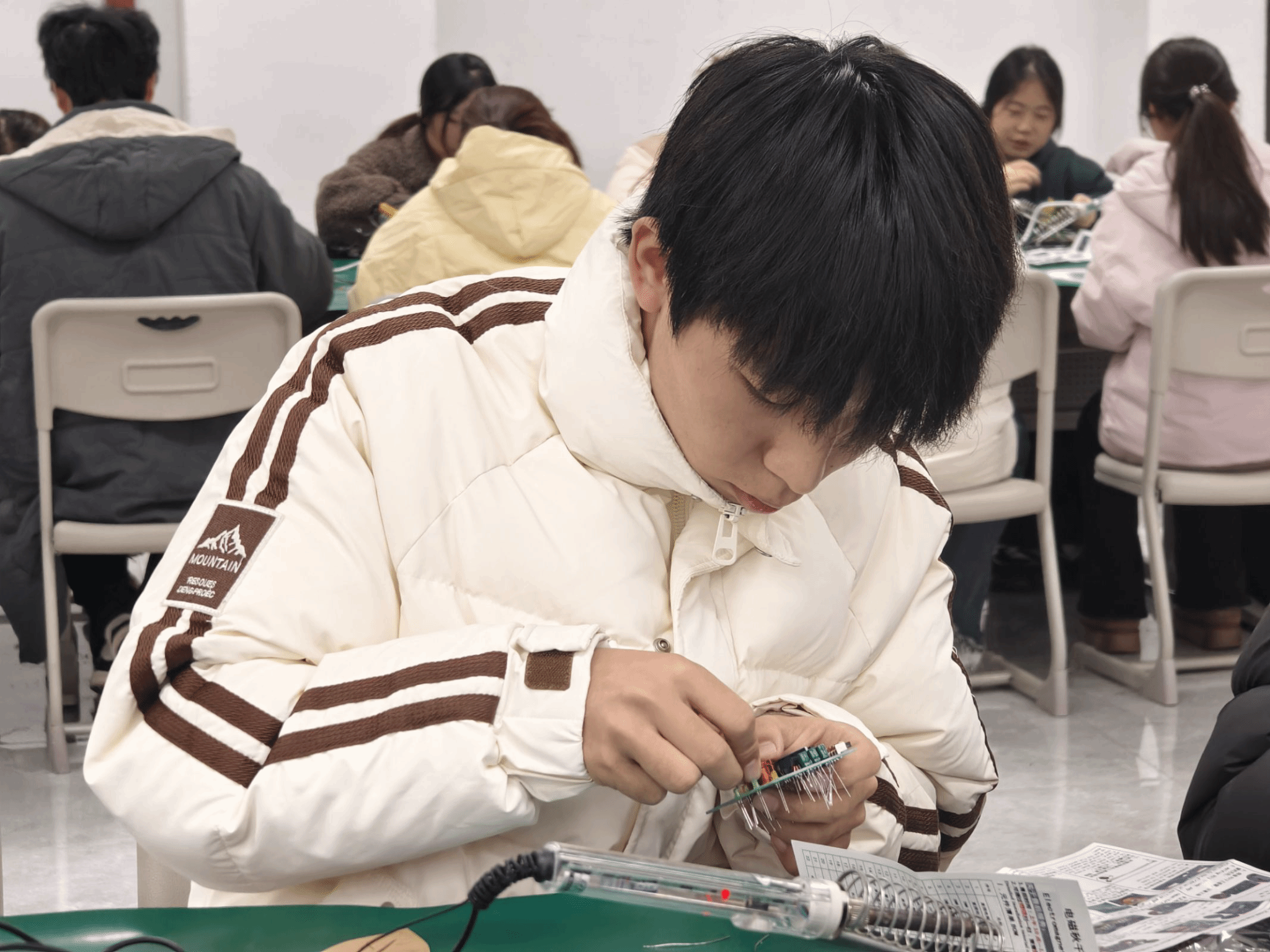 该环节为实践操作,选手们需在规定时间内,以给定的元件材料完成指定的焊接任务。同学们以精湛的焊接技术,让锡线逐渐融合。伴随着空气中松香的气味弥漫,在他们的巧手下,一件件精美的焊接作品初见雏形。