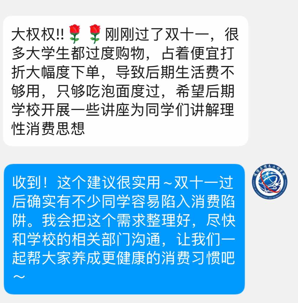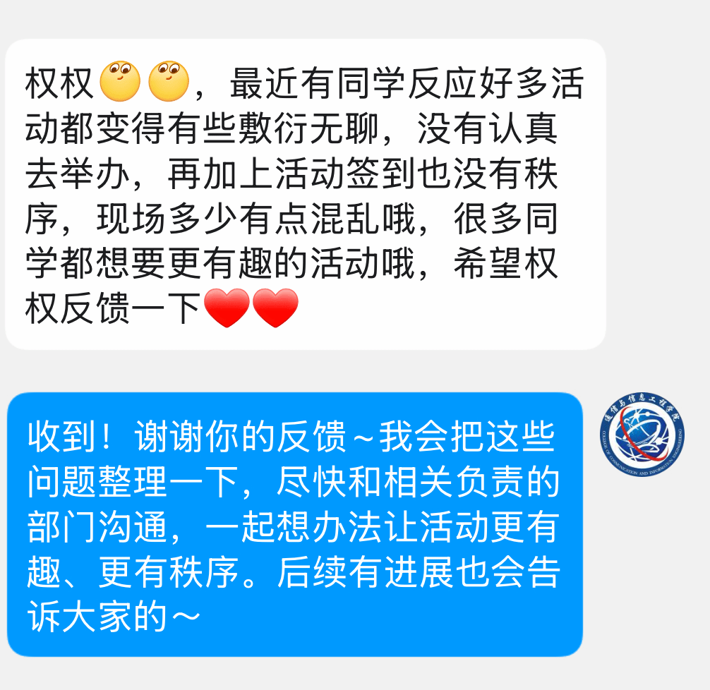 权益护航无旁骛,殷殷初心暖校园。在往后的工作中,通信与信息工程学院学生会权益部将持续聚焦同学们的校园生活诉求,以“事事有跟进,件件有落实”的行动力,架稳学生与学校的双向沟通桥梁,共同打造更添关怀,更优体验的校园生活共同体。