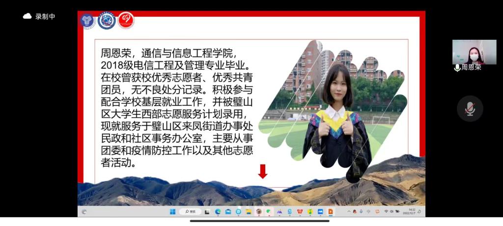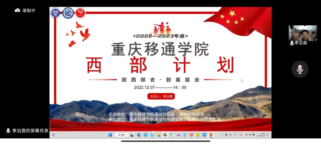 为帮助当代青年了解西部计划,鼓励移通学子到西部去、到基层去,2022年12月7日,通信与信息工程学院青年志愿者协会特邀智能工程学院2018级张芮意同学、通信与信息工程学院2018级周恩荣同学以及通信与信息工程学院2018级刘珊同学,在腾讯会议开展2023年西部计划线上宣讲会。