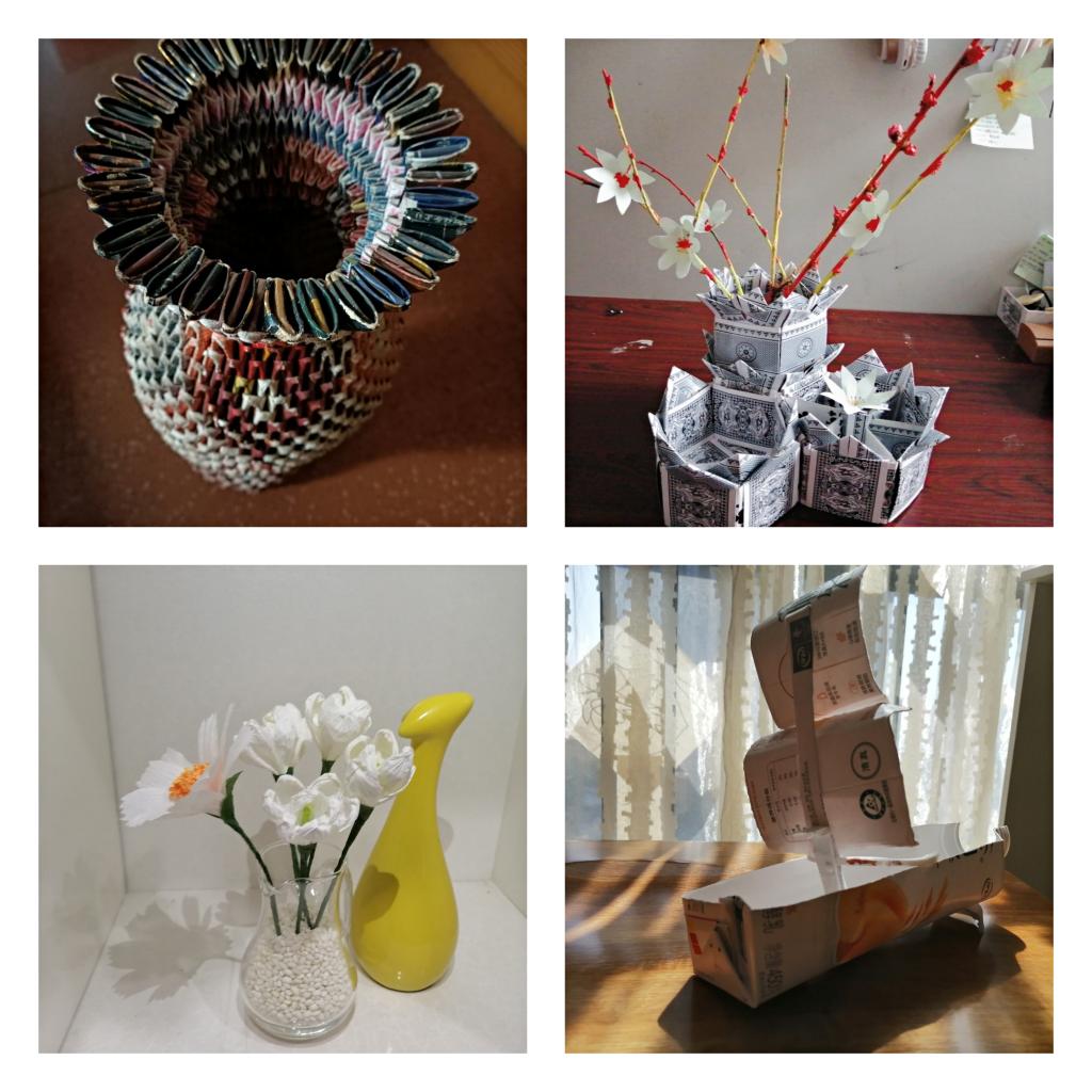 废物回收再利用,一方面解决了废品回收困难的问题,另一方面避免了造成不必要的浪费。同学们用家中的废旧物品制作出了精美的笔筒、首饰收纳盒、工艺装饰品等,实现了废物再利用的环保意义。