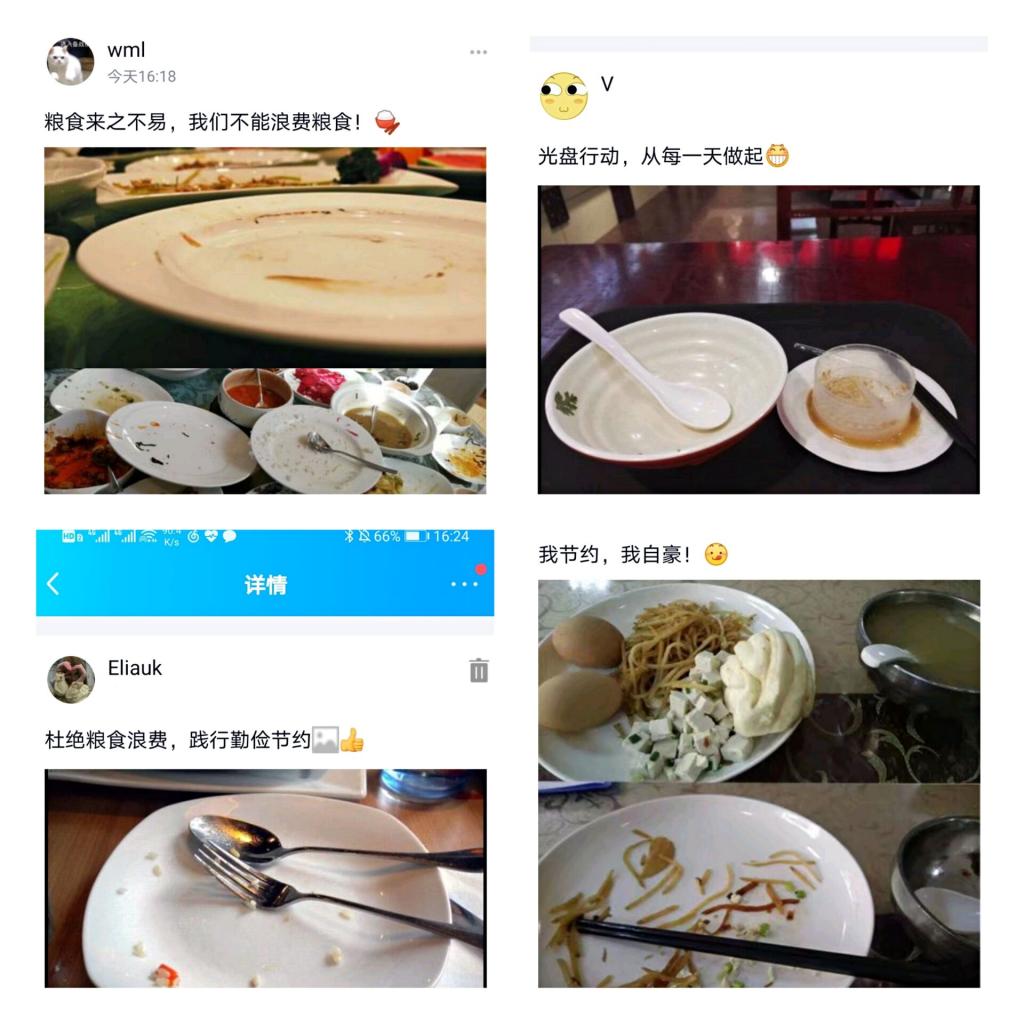 “一粥一饭,当思来之不易;半丝半缕,恒念物力维艰”。勤俭节约一直是中华民族的传统美德,同学们利用个人社交平台,上传自己的“光盘”照片并进行“光盘”宣言:“珍惜粮食,从我做起”、“我节约,我自豪”等。通过一个月的光盘打卡,同学们做到了杜绝“舌尖上的浪费”,养成了“吃多少盛多少”的习惯,深刻领会了“谁知盘中餐,粒粒皆辛苦”的深意。