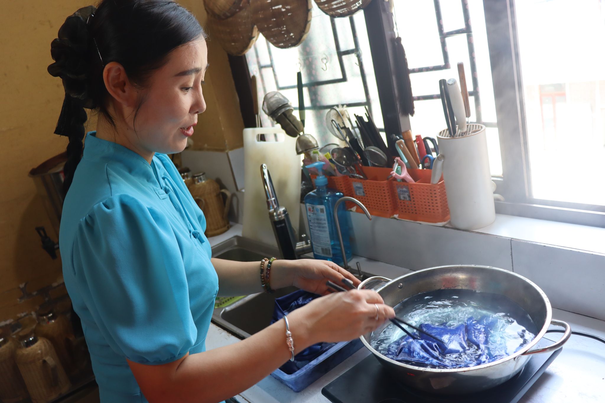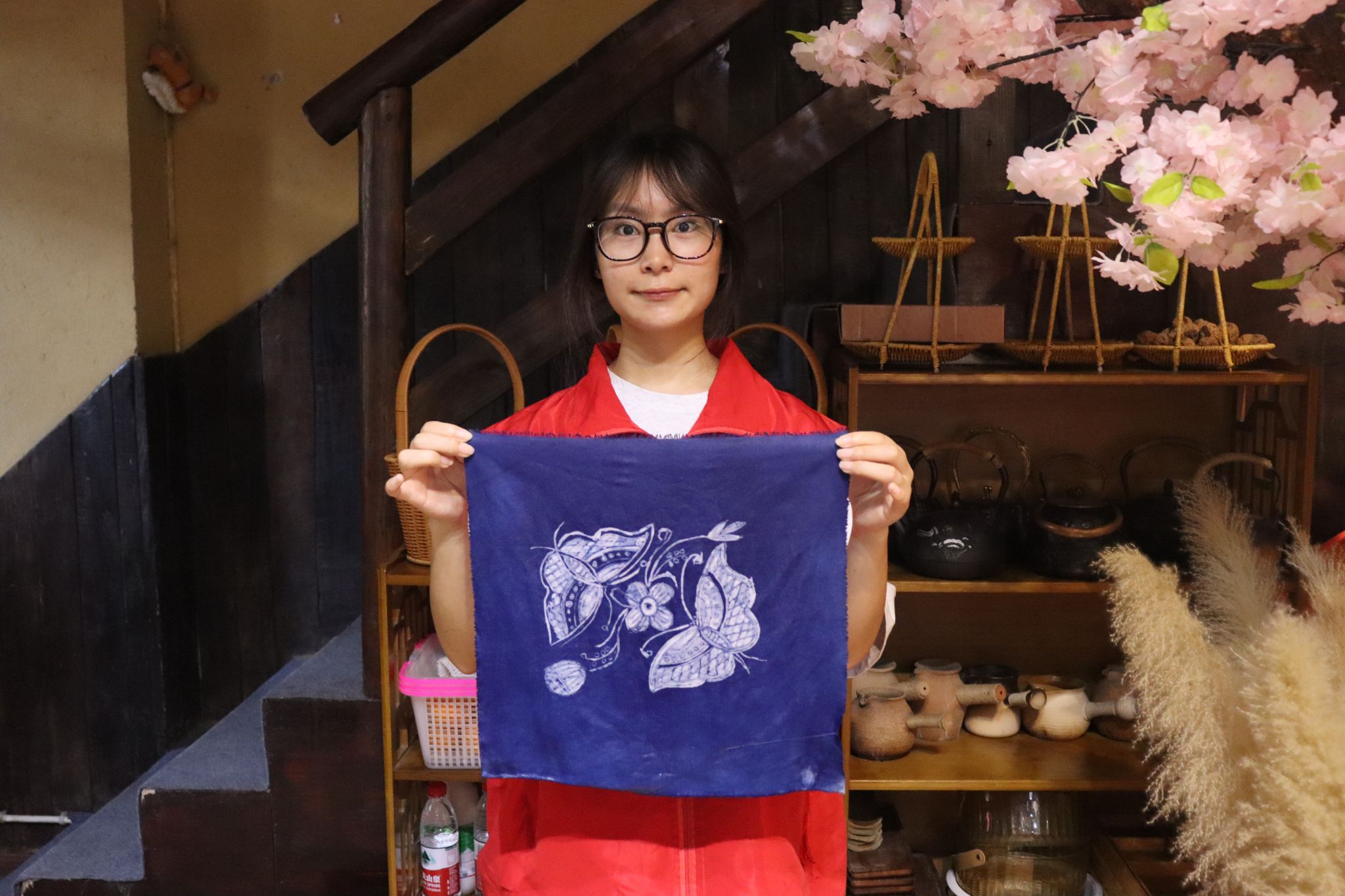 志愿者们将画好蜡的布料浸泡在蓝靛染料中,一块方巾,一尺蓝布,一笔一划,一点一捺,柔和的布料上,蓝色的花纹如梦幻般绽放。浸染后的布料在热水的轻抚下,,蜡液如同被施了魔法的精灵,在热水的怀抱中渐渐融化、脱落,带着使命的余晖,留下了一幅幅纯净如雪的图案,那是时光与技艺交织的绝美画卷。志愿者们纷纷表示,通过这次学习,不仅掌握了蜡染的基本技巧,更深刻地领略到了传统文化的魅力。