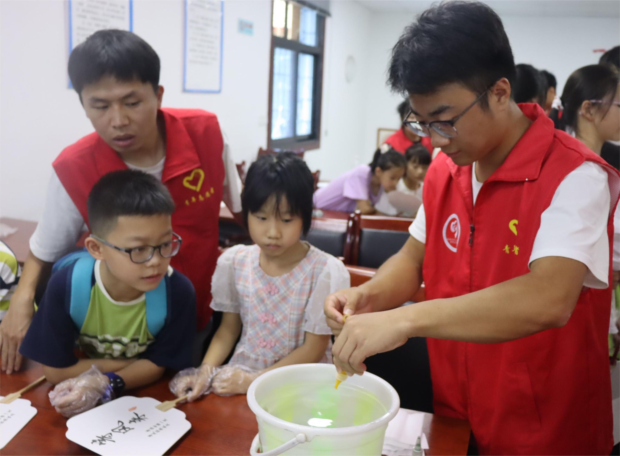 首先团队成员向小朋友们介绍团队相关情况,随后便邀请社区团支部书记向小朋友们细心讲解有关漆扇的制作相关技巧及注意事项,并亲手示范制作漆扇,当漆善成品展现在大家的眼中时,现场便响起志愿者和小朋友们的掌声,他们眼神中充满了对漆扇制作的期待,而后志愿者们便与小朋友们一起精心挑选着自己心仪的扇面与色彩。志愿者们大手握小手,小心翼翼地在水面上勾勒出心中的图案,轻轻地将书签、团扇纸袋等物件浸入水中,任其自由吸附色彩。