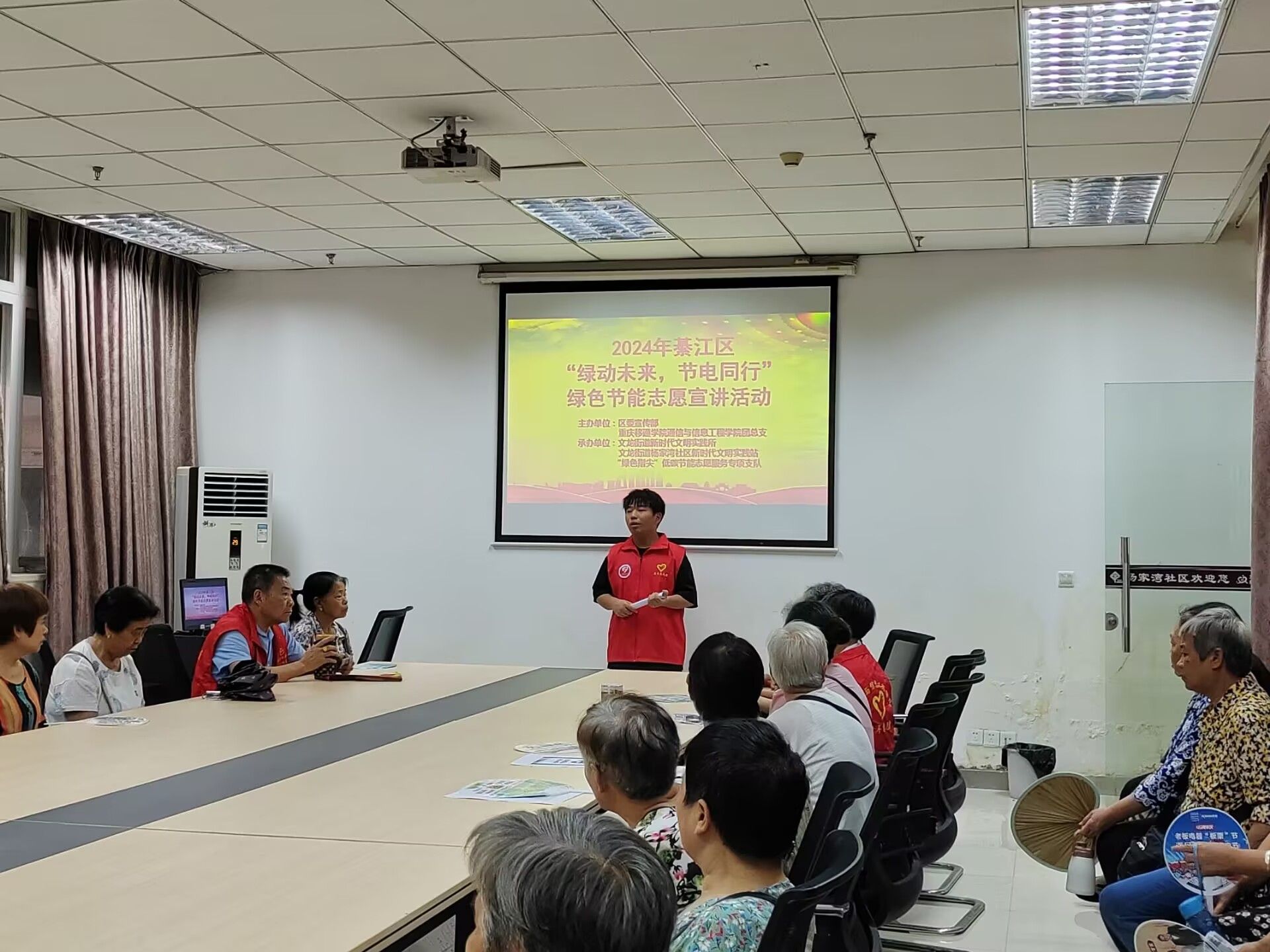 为了缓解重庆市炎热天气下全市居民的用电压力,确保居民生活用电稳定,同时践行绿色环保理念,重庆移通学院綦江校区通信与信息工程学院“绿色指尖”低碳节能志愿服务专项支队于2024年9月20日下午在杨家湾社区开展“‘绿动未来,节电同行’绿色节能志愿宣讲”活动。此次活动共计参与人数40余人,受益人数100余人。