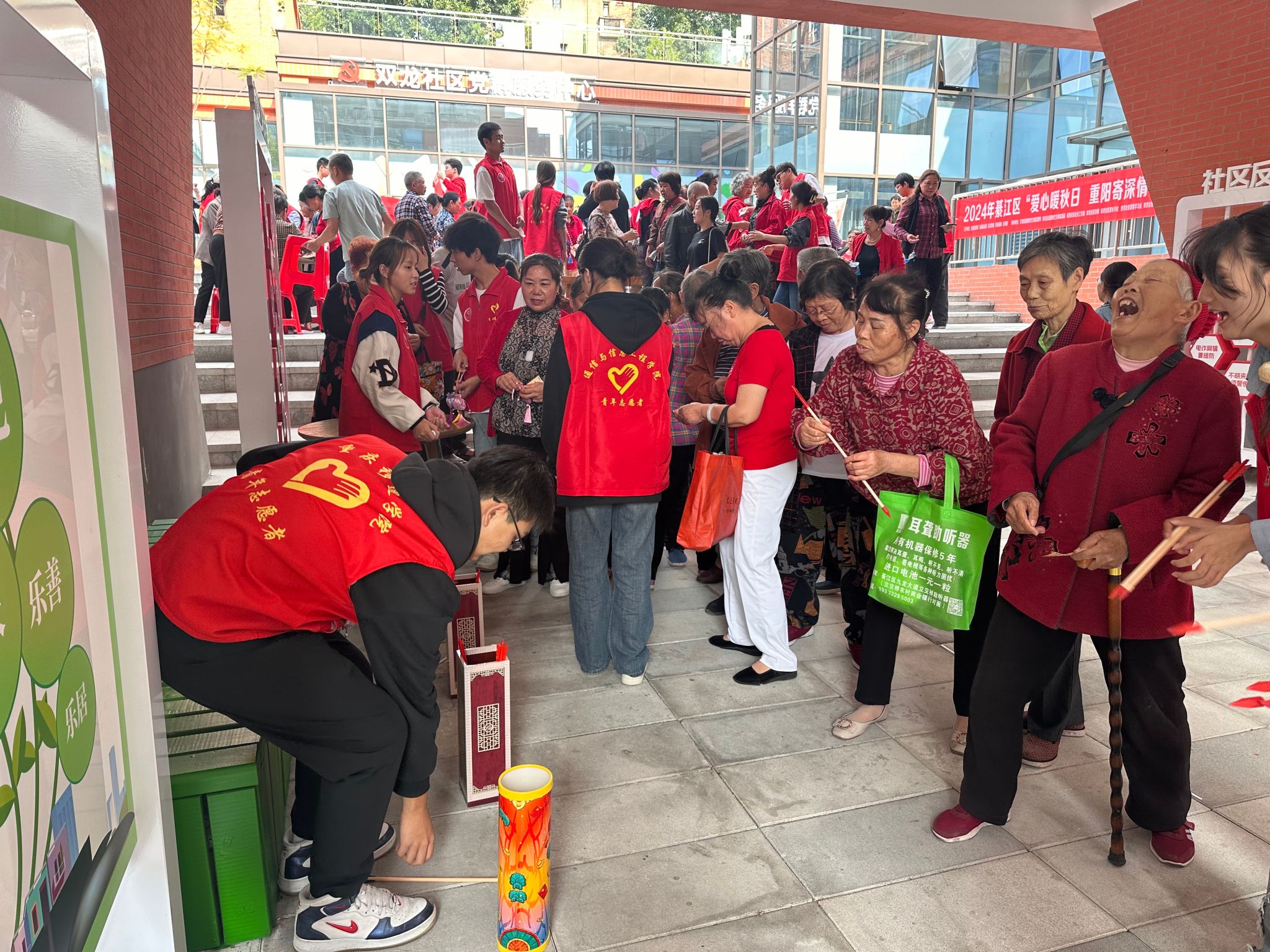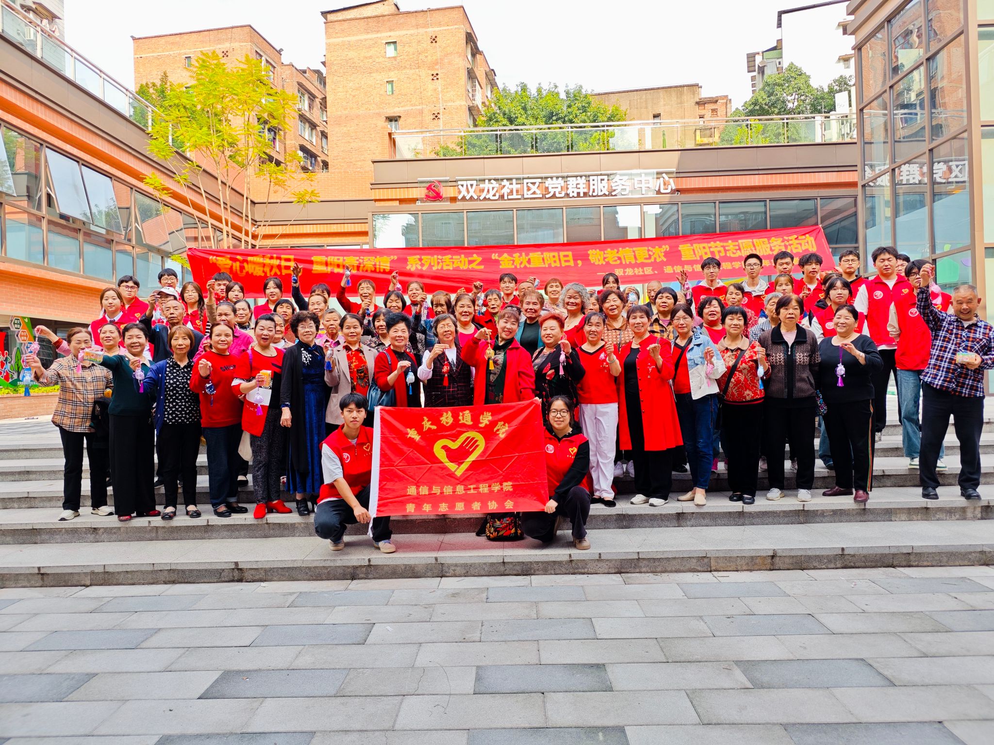 金秋送爽、丹桂飘香,重阳佳节之际,为弘扬中华民族尊老敬老的传统美德,给老人送去陪伴与祝福。特此,通信与信息工程学院青年志愿者协会联合双龙社区于10月9日在双龙社区举办“爱心暖秋日,重阳寄深情”的重阳节志愿服务活动,旨在为社区老人送上关爱与温暖,让老年人在节日里感受到社会的温暖与关怀。此次活动共计参与80余人,受益200余人。