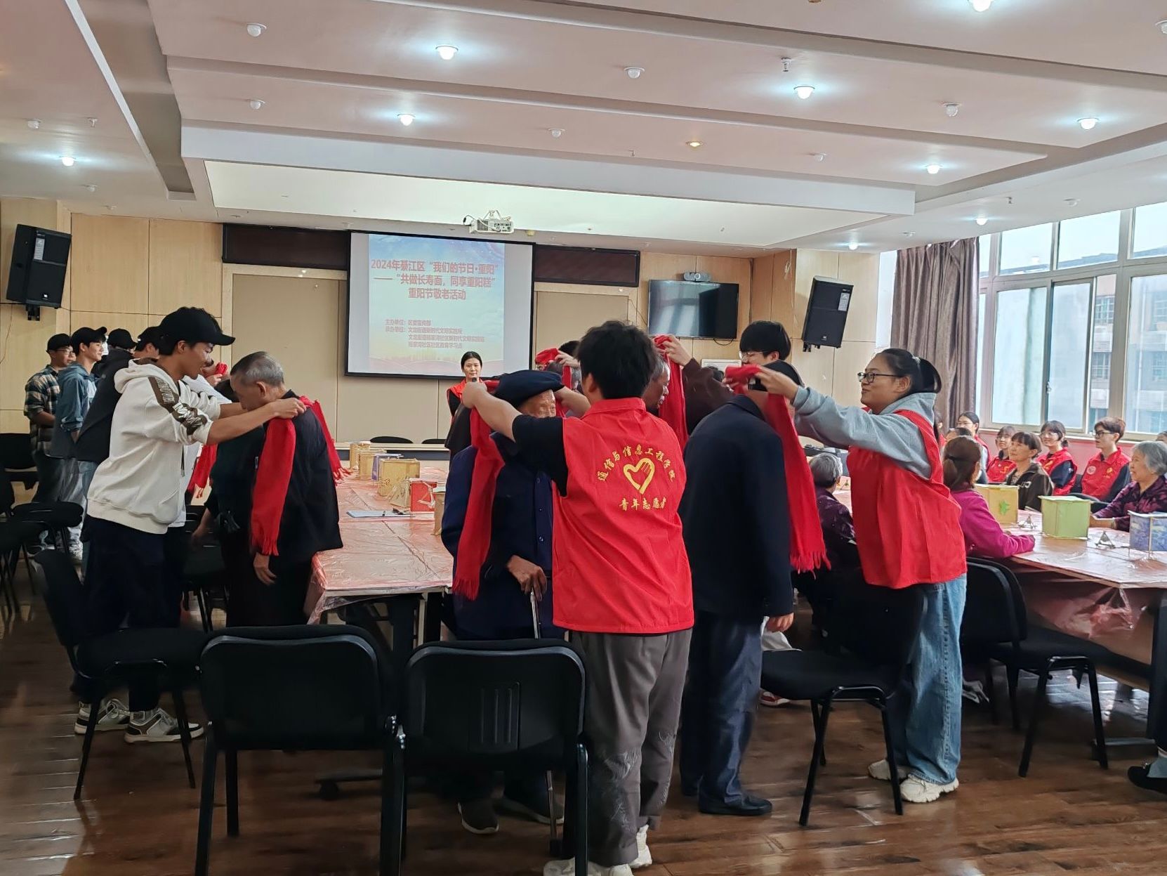 活动的第一项就是由志愿者们为老人献上围巾,在这个美好的日子里,志愿者们用他们的爱心和温暖为老人们献上了围巾。当志愿者们将围巾轻轻地围在老人们的脖子上时,老人们的脸上洋溢着幸福的笑容,那一条条柔软的围巾,不仅为老人们带来了身体上的温暖,更传递着志愿者们对老人们的关爱与尊重。