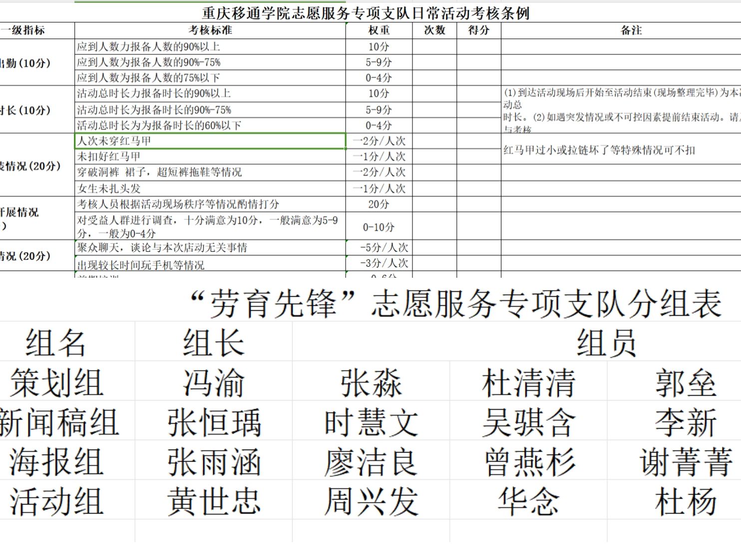 “不以规矩,不成方圆”。一个好团队的形成,必定是离不开“规矩”两字的。为打造“六边形”团队,方便支队管理以及对支队成员进行定期考核,支队长提出对支队进行分组管理模式,并制定了支队成员考核计划表。对于支队成员将从支队活动,例会请假、支队活动参与度、支队活动表现三个方面进行考核。支队整体分成四个小组:策划组、新闻稿组、海报PPT视频组、活动组。“劳育先锋”志愿服务专项支队支队长唐伟道:“本支队将严格按照支队考核表对支队成员进行考核,希望各位队员们各司其职,积极参与到支队活动中,为支队建设贡献自己的力量。”