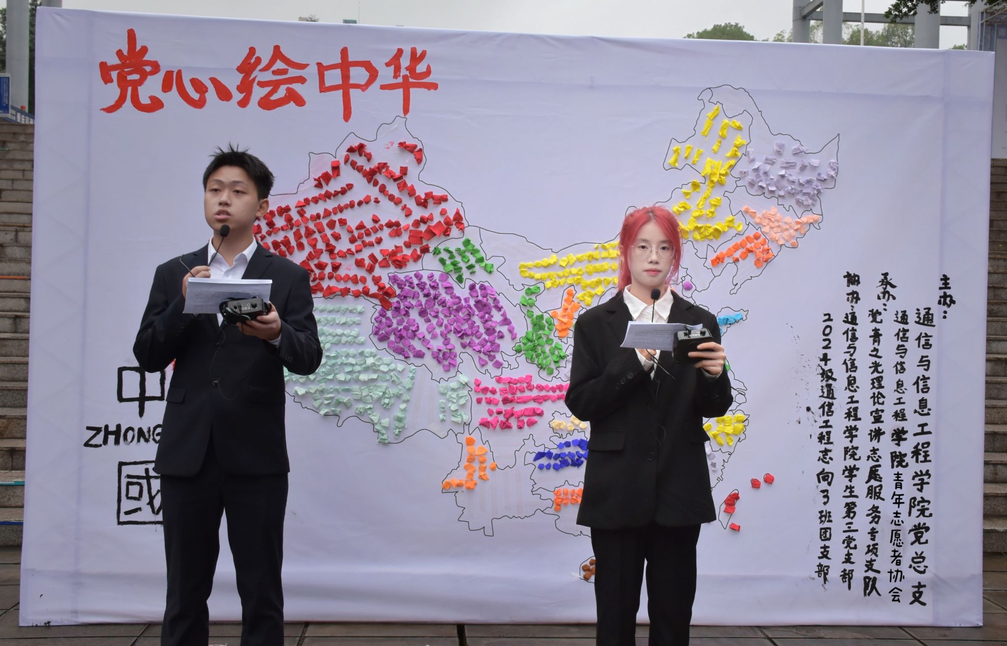 为了更好地积极响应党的号召,深入贯彻落实党的二十大精神,进一步培养通信学子爱党爱国的情感,营造矢志不渝的爱国氛围。2024年10月17日12:30-13:40,由重庆移通学院通信与信息工程学院党总支、通信与信息工程学院青年志愿者协会主办,“党青之光”理论宣讲志愿服务专项支队承办,通信与信息工程学院学生第三党支部、2024级通信工程志向3班团支部协办的“党心绘中华:以名相连,共绘家园情”系列活动在重庆移通学院合川校区黄桷树广场成功举办,出席本次活动的嘉宾党总支副书记熊斌同志、党总支组织委员杨青松同志、第三党支部书记孙怡同志、学生第三党支部组织委员兼“党青之光”理论宣讲志愿服务支队指导老师李林燕同志以及党员同志代表34人、学生代表100余人。