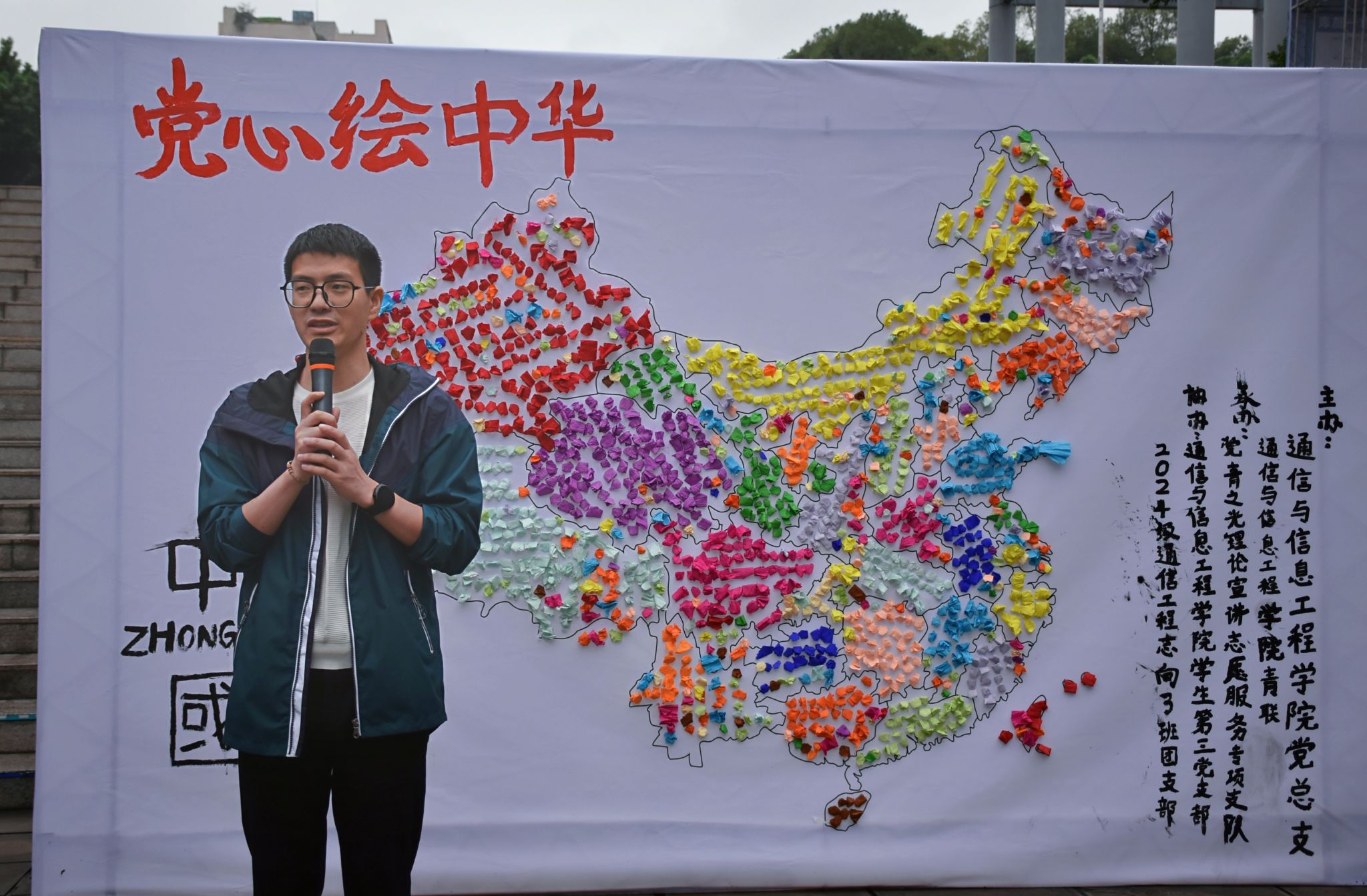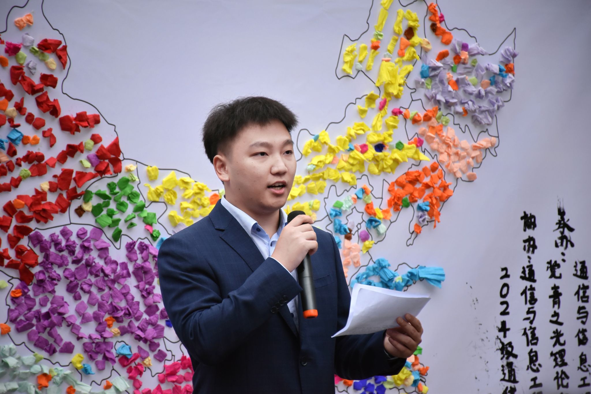 重温宣誓,震撼人心。在完成中国地图装饰之后,优秀共产党员钟烨同志在中国地图前感慨,“我们既要对当下时光的负责,也要成为未来国家的担当。昔日国难当头,我等未能为国尽力,今日吾之少年,为国家崛起而奋斗,为达心中之远方,而砥砺前行。”以初心,敬党心;以誓言,敬理想。当党总支组织委员杨青松同志带领着通信学子们面对着中国地图时,同学们眼含热泪,挥舞着手中的红旗。当他们举起右拳高呼自己的姓名,以坚定的目光注视中国地图,一字一句坚定的喊出“我志愿加入中国共产党……随时为党和人民牺牲一切,永不叛党”的铿锵誓言时,清澈的爱,只为中国在此刻具象化。