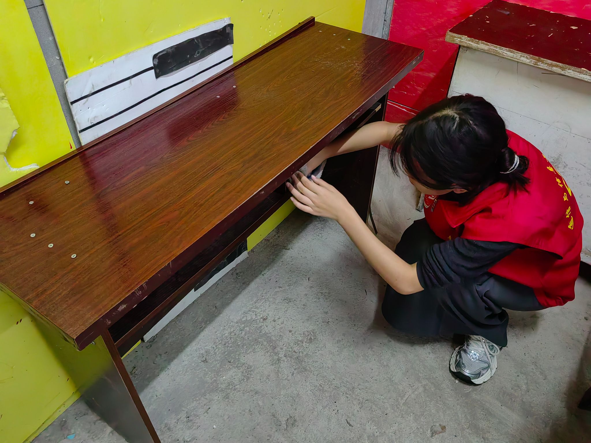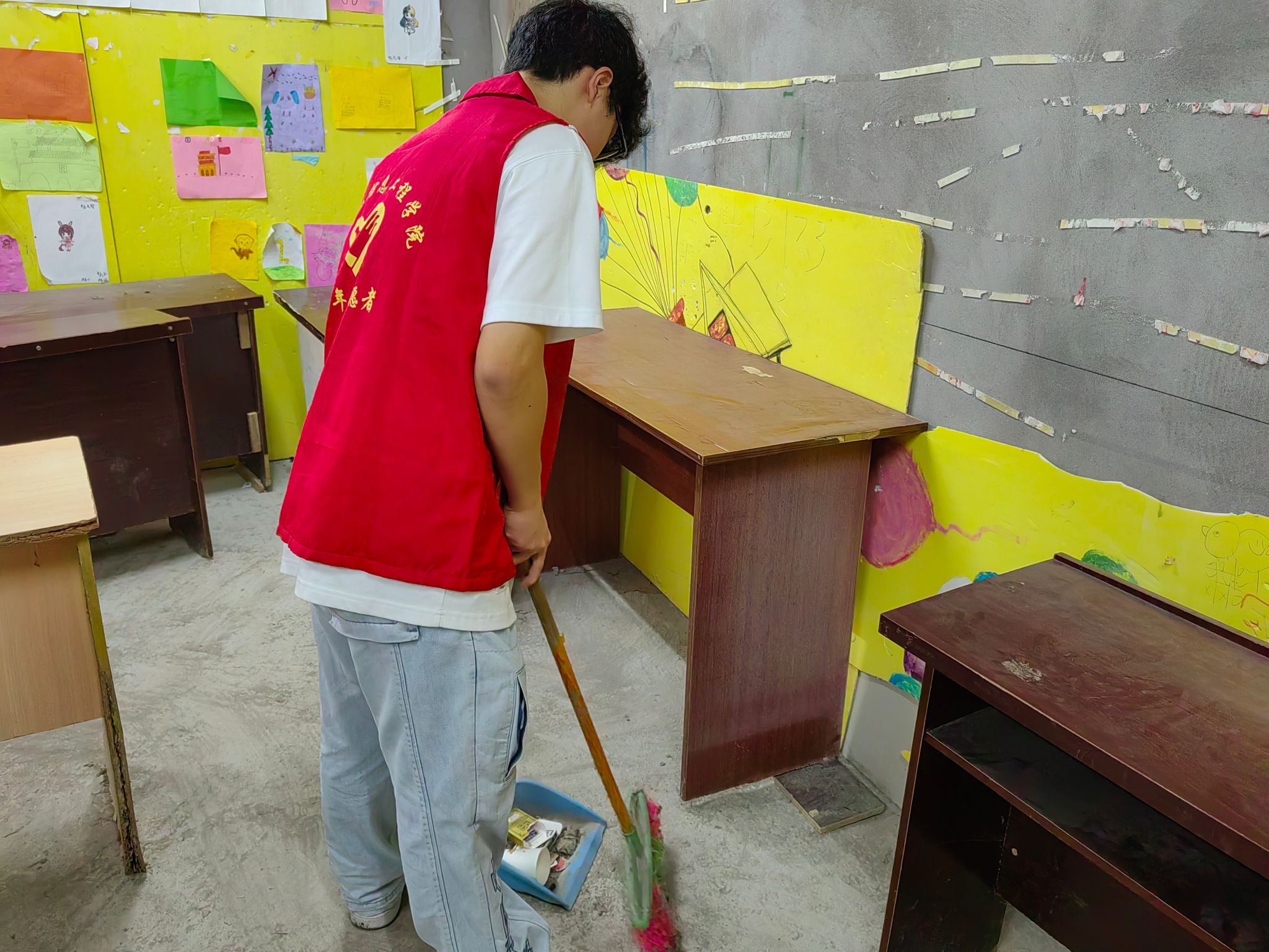 在活动开展前,支队长带着志愿者们提前到达阵地对这个许久未来的地方进行了卫生打扫,给即将到来的孩子们提供一个舒适安稳的学习环境。