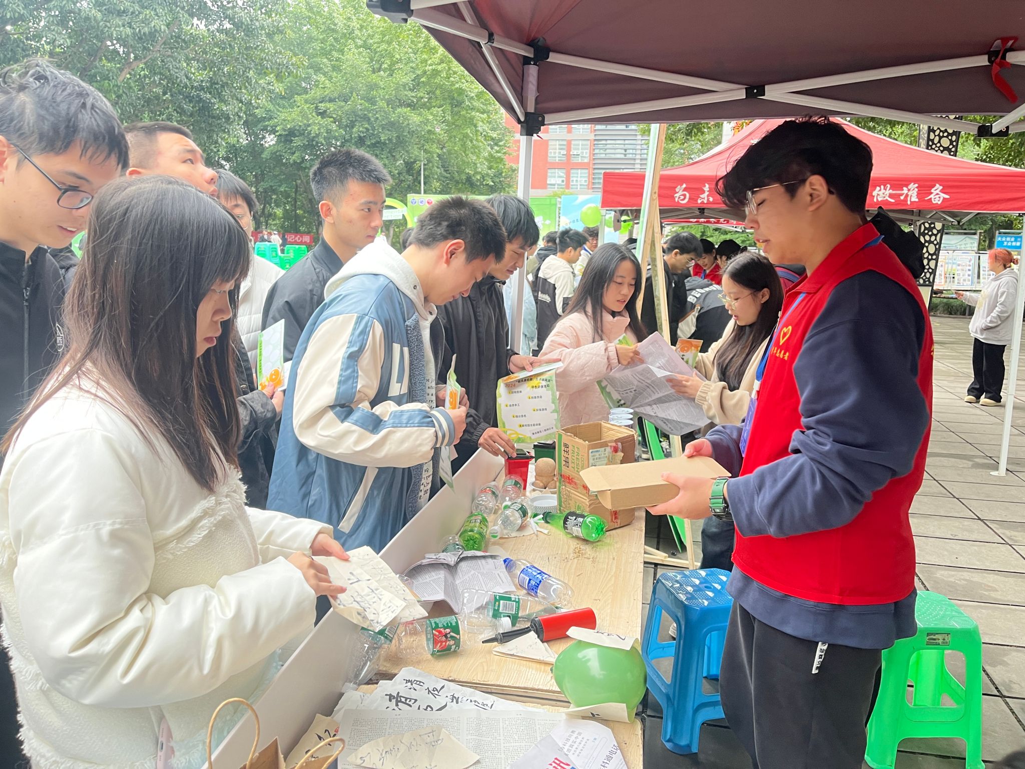 在旧物换新区、创意改造区内,同学们将自己的“书籍、文具、衣物”等闲置物品进行置换,绿色盆栽作为置换物与同学们进行交换,以旧换新。另外,同学们还以“废纸、所料瓶”等为原材料进行创作,上演“变废为宝”的精彩创作。