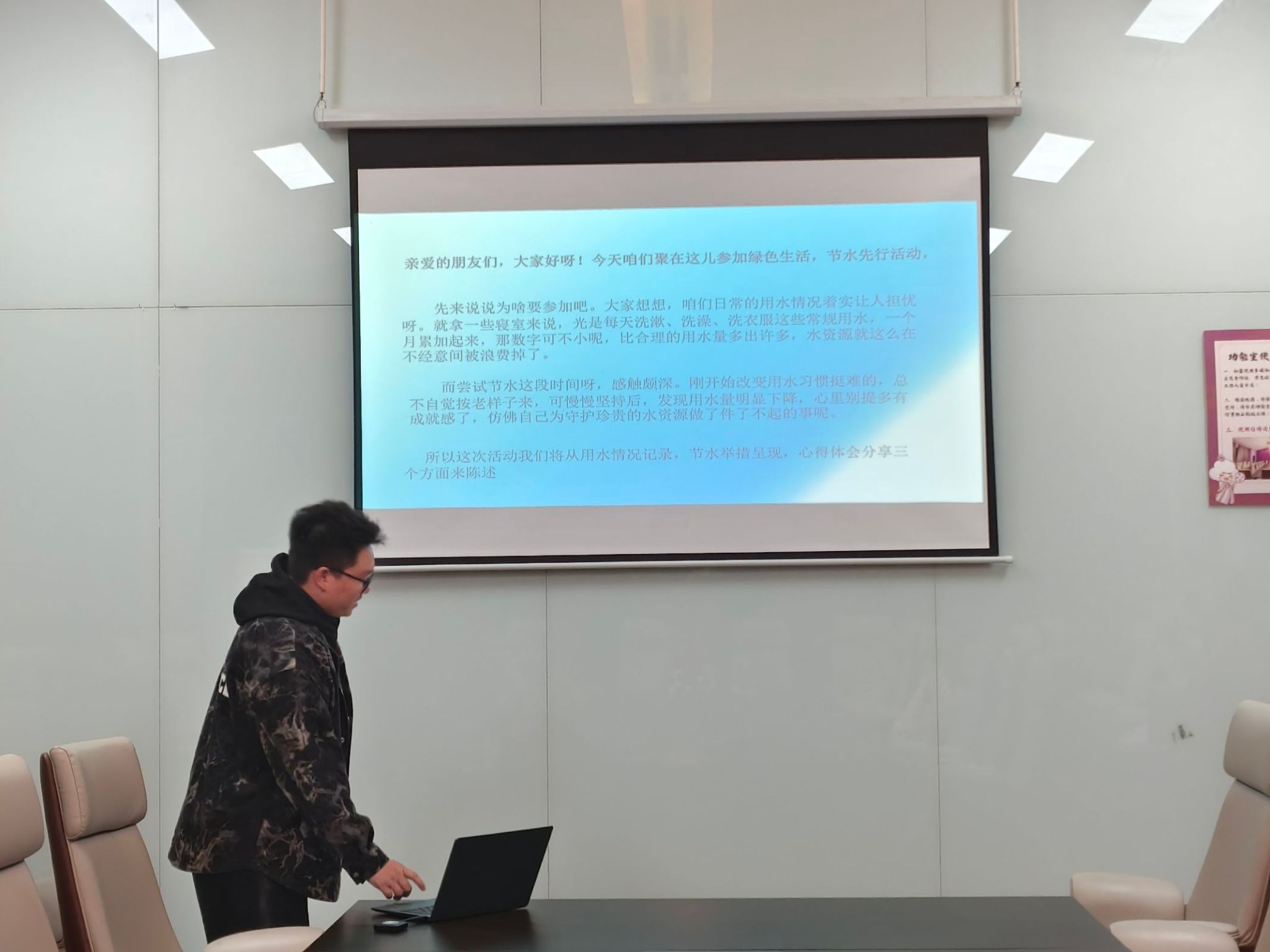 为了提升学生的节水觉悟,培育环保生活习惯,让学生深切领悟到水资源的珍稀,学会在日常点滴中珍惜水资源,让节水风尚在校园蔚然成风,引领更多人投身节水行动,共同守护水资源、为构建节水型社会添砖加瓦。故而,11月13日起,“绿色指尖”低碳节能志愿服务专项支队开展了为期8天的节水活动,于11月20日下午2点观云书院小雪·会议室进行线下答辩与总结。本次活动共计参与人数30余人,受益人数50余人。
