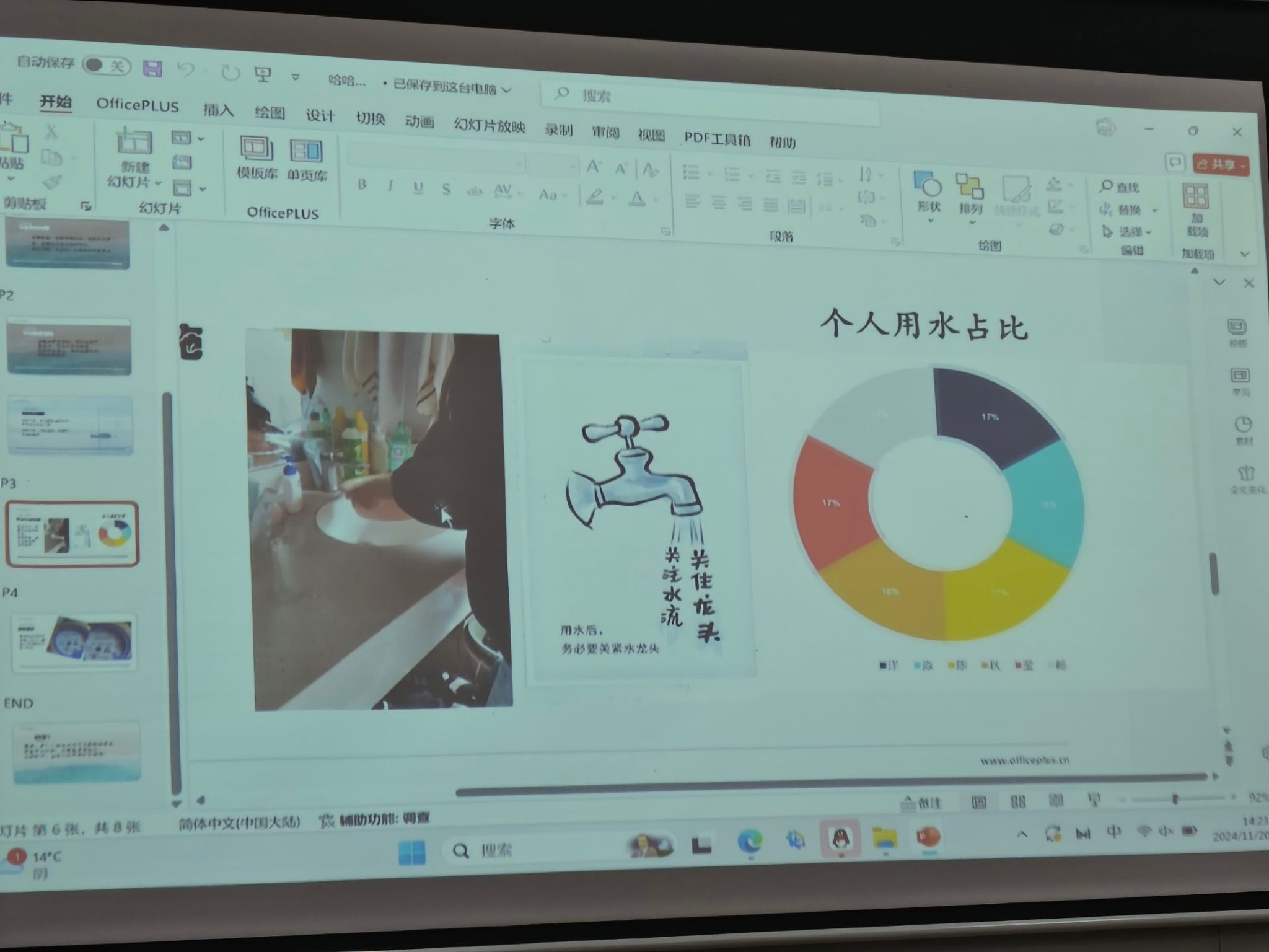 在为期8日的活动准备期间,参赛者们详尽记录了各自宿舍在洗漱、洗衣、饮水等多个方面的用水量。通过细致入微的观察与记录,同学们深切感受到了日常生活中水资源的消耗状况,也意识到了节水任务的紧迫性和重要性。在数据记录的基础上,参赛者们还精心策划并制作了PPT,以生动形象的图文方式展示了宿舍节水的策略和成果。每一页幻灯片都凝聚了同学们的聪明才智和辛勤付出,彰显了他们对于节水事业的满腔热忱和坚定信念。