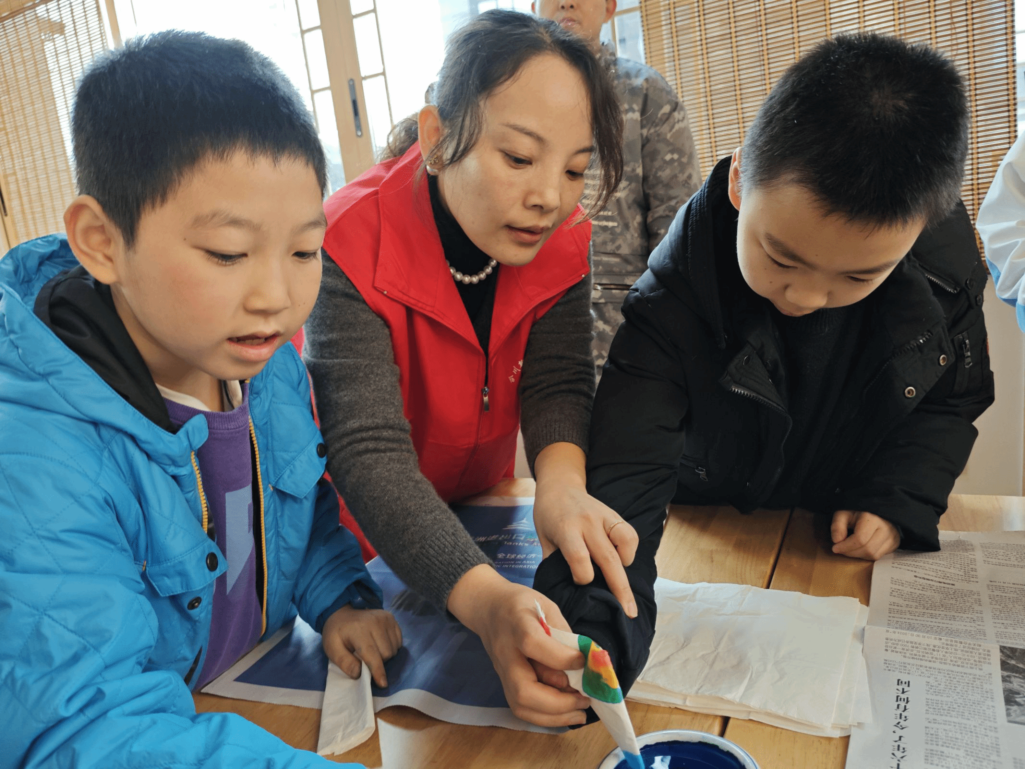 志愿者在桌上摆放了各种各样的颜料,小朋友们立刻全神贯注地投入到创作中,小脑袋里充满了各种奇思妙想,用斑斓的色彩描绘出心中的梦想世界。老师和志愿者们也一直在旁边细心地指导着。他们耐心地解答着小朋友们的疑问,手把手地教他们如何用棉签蘸取颜料,鼓励他们大胆创作。老师和志愿者们的身影穿梭在小朋友们中间,他们的微笑和鼓励如同一缕温暖的阳光,让小朋友们更加自信地展现自己的才华。大家都沉浸在这充满乐趣和创意的氛围中。