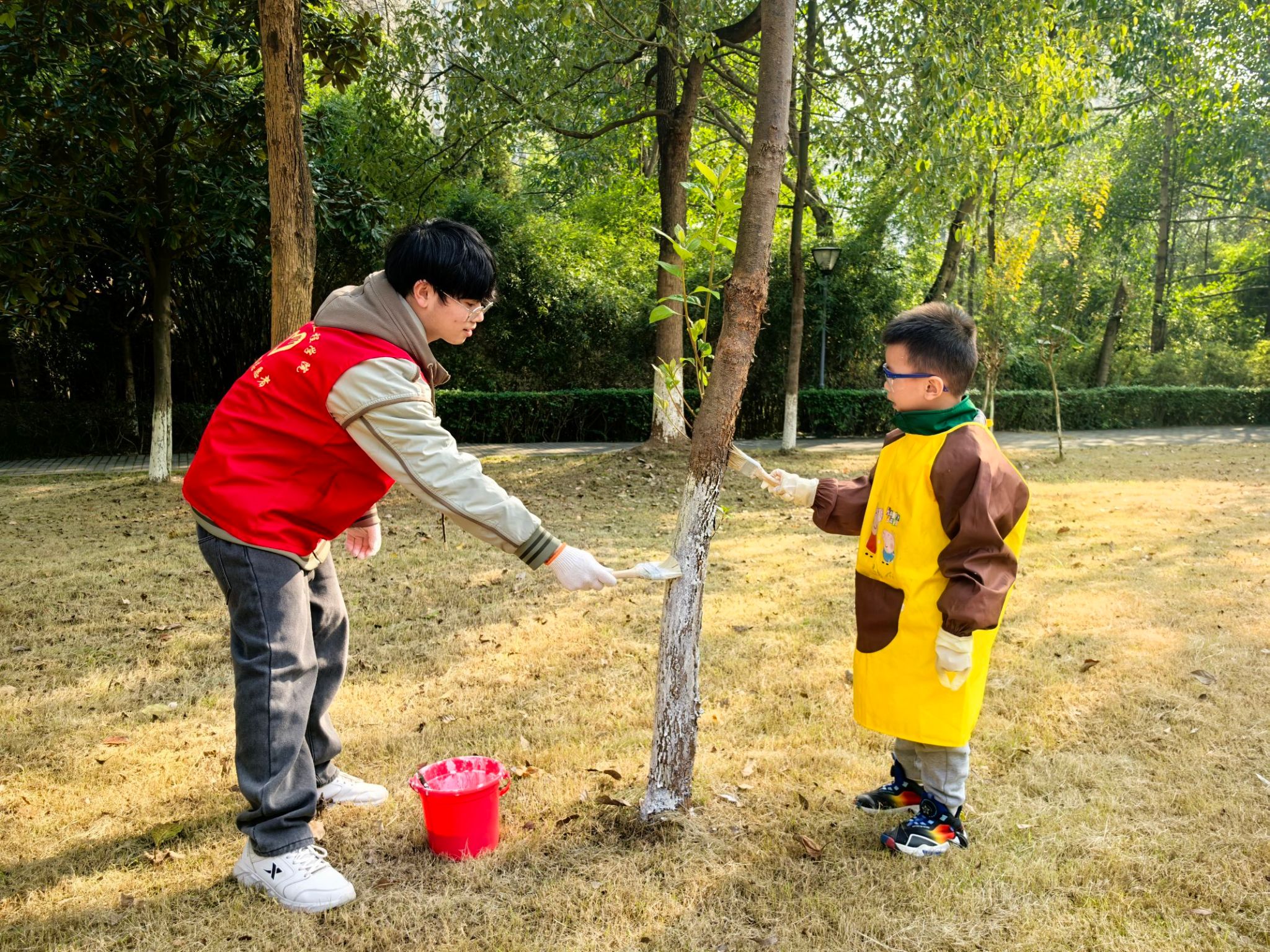 由重庆移通学院的树木保护师傅详细讲解了树木刷白的重要性以及具体操作方法,并进行了全过程示范。刷白剂不仅能为树木防虫保暖,还能起到美化环境的作用。示范结束后,更是少不了志愿者们忙碌的身影。他们贴心地为每组家庭准备并发放刷子、手套等工具,保障大家能顺利开展为树木刷白的工作。在“环保360”志愿者的悉心指导与热情帮助下,新华幼儿园的小朋友们以及家长们才得以有条不紊地对大树进行刷白操作。新华幼儿园的小朋友们亲身体验为树木刷白,感受着劳动的乐趣,也理解了保护树木的重要性。树木作为大自然的 “绿色卫士”,对环保有着不可替代的作用。其庞大的树冠与枝叶能吸附空气中的灰尘、有害气体等污染物,净化空气,让我们的呼吸更加清新健康,大树在涵养水源、调节局部气候等方面也发挥着极为关键的作用,是构建生态平衡与美好环境的基石。