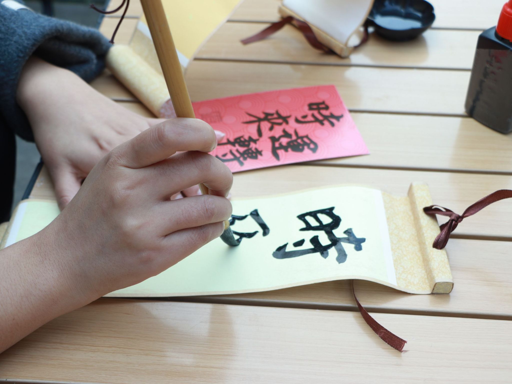 紧邻着一旁的毛笔摊位上,前去体验的每一位通信学子拿出书法大师的风范,挽袖提笔,挥毫泼墨,笔锋游走如龙蛇,一笔一划在卷轴上写下对祖国的美好祝愿。