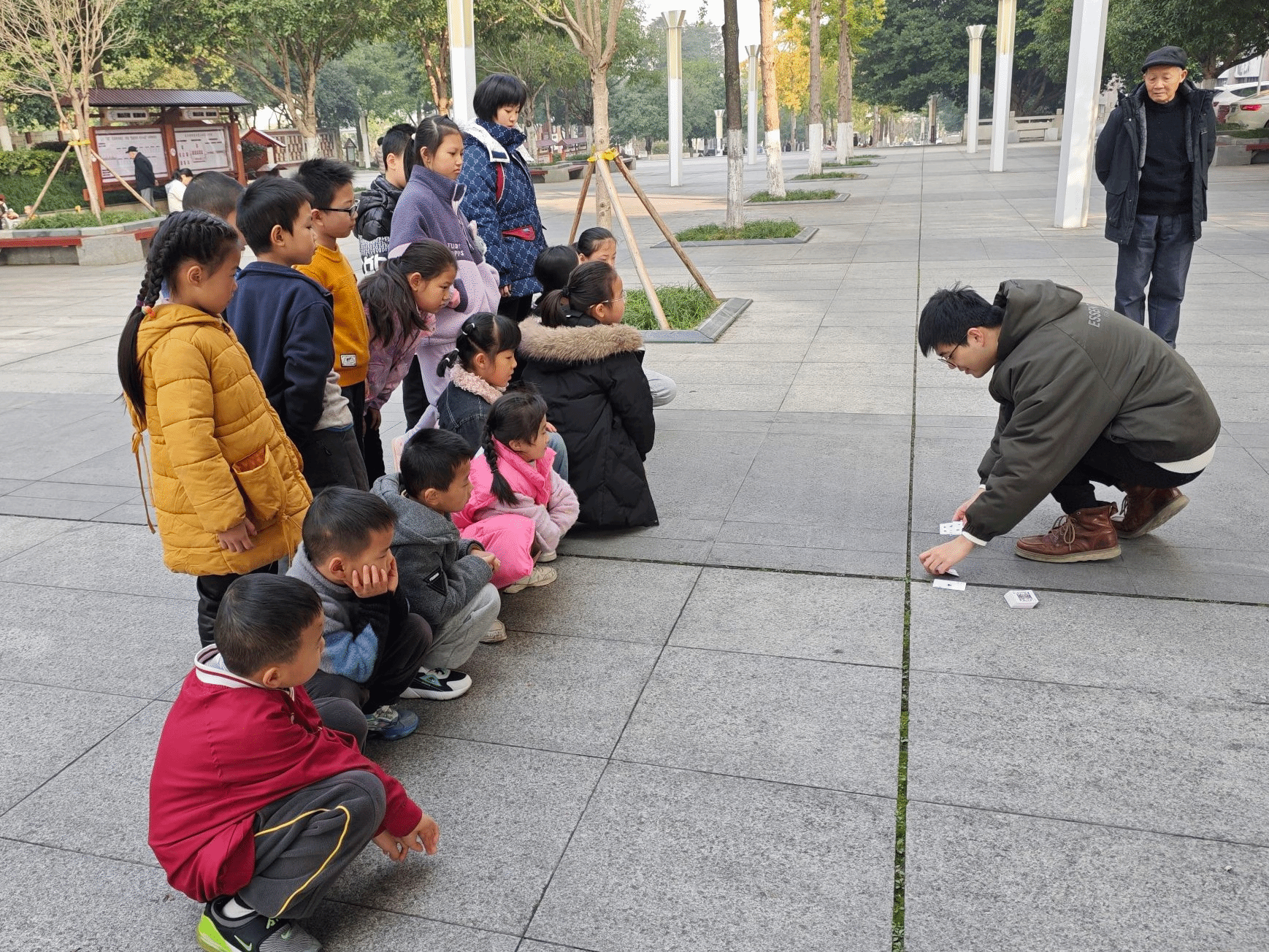 为了让小朋友们释放身心,老师带领小朋友们来到室外,开启了令人期待的游戏环节——搭桥滚球和翻纸牌。老师先是用通俗易懂的话语给小朋友们讲解了游戏规则,紧接着,组织小朋友们按照年龄大小排成两列,一切准备就绪后,有序地开展游戏。同时着重强调在游戏过程中,小朋友们一定要具备强烈的团队意识以及集体荣誉感,并且不忘温馨提醒大家注意自身安全。在老师和志愿者们有条不紊的带领下,小朋友们很快便全身心地投入到游戏当中,他们在游戏过程中尽情欢笑,收获了满满的快乐和喜悦。