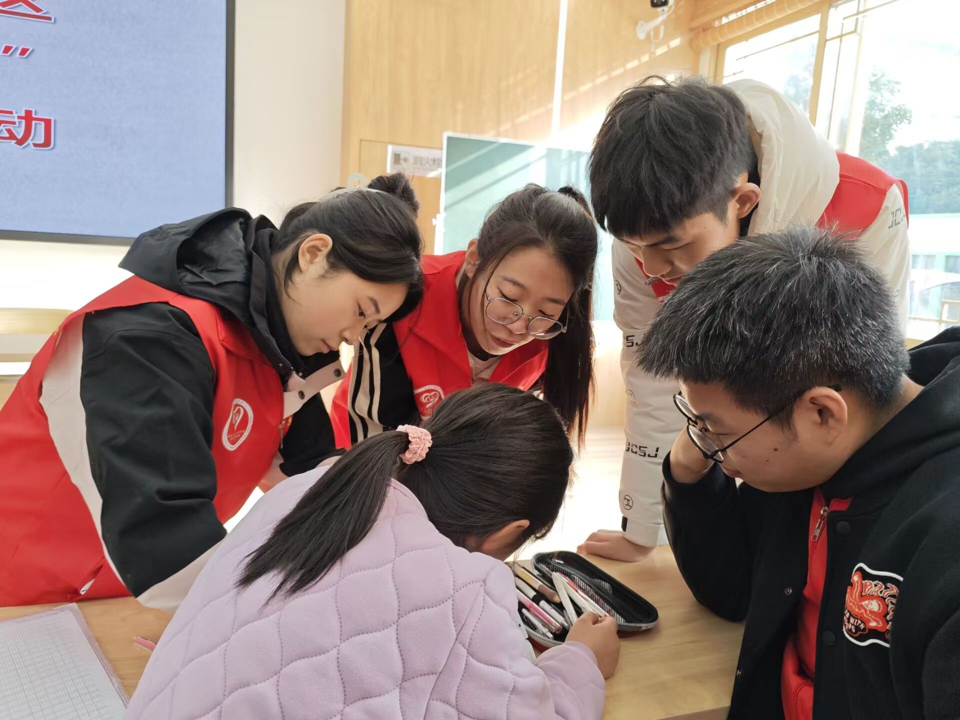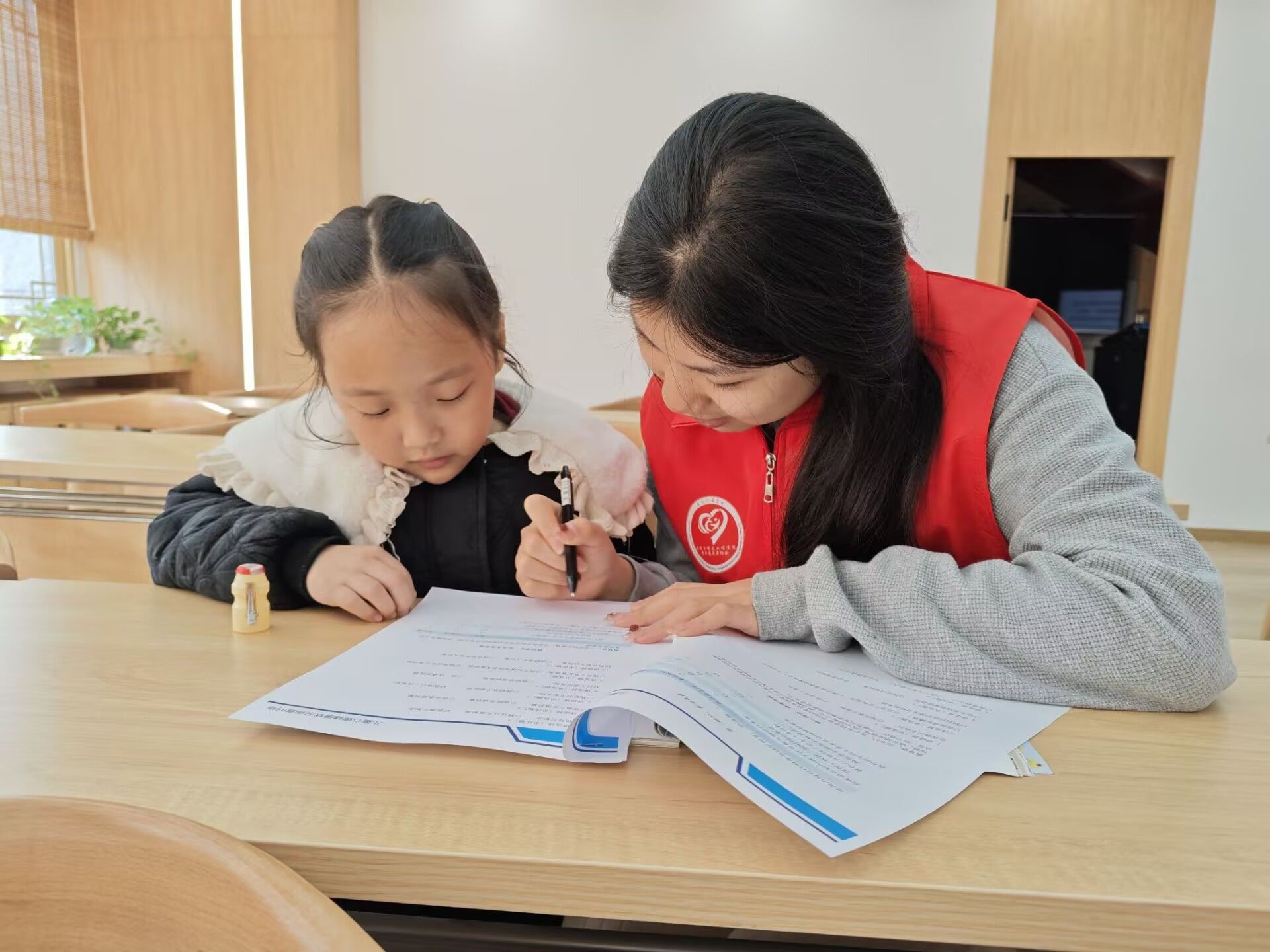 在本次活动现场,支队成员们一如既往地来到白鹿山社区服务中心室内,耐心地为小朋友们辅导课后作业。45分钟下课后,合川区老师贴心地为小朋友们发放了心理测试卷,旨在了解小朋友们当下的心理状态,给予他们更有针对性的关怀。志愿者们则在协助小朋友们识字、填表。随后,老师也针对小朋友们的基本情况和问题,为大家开展了心理知识讲座。