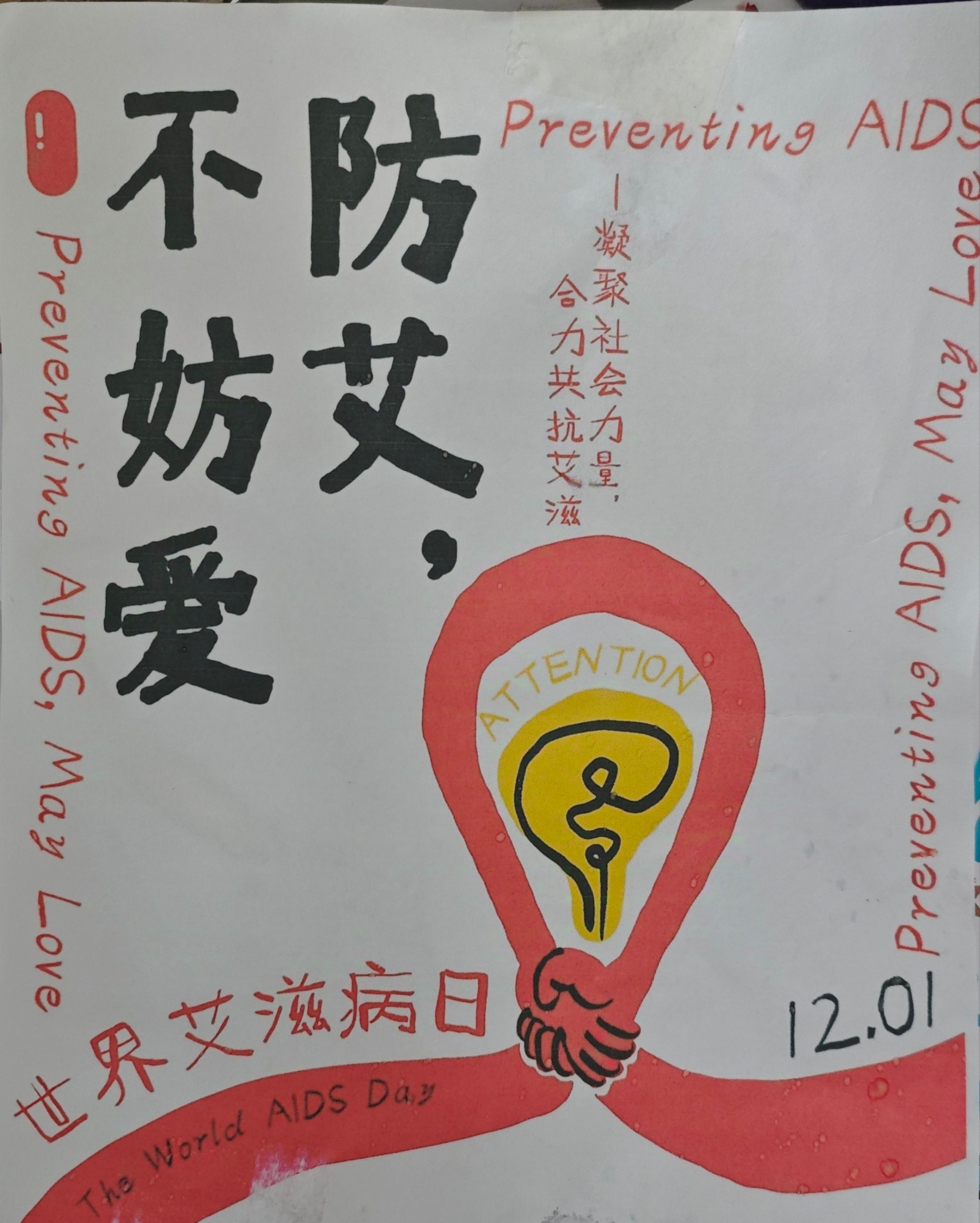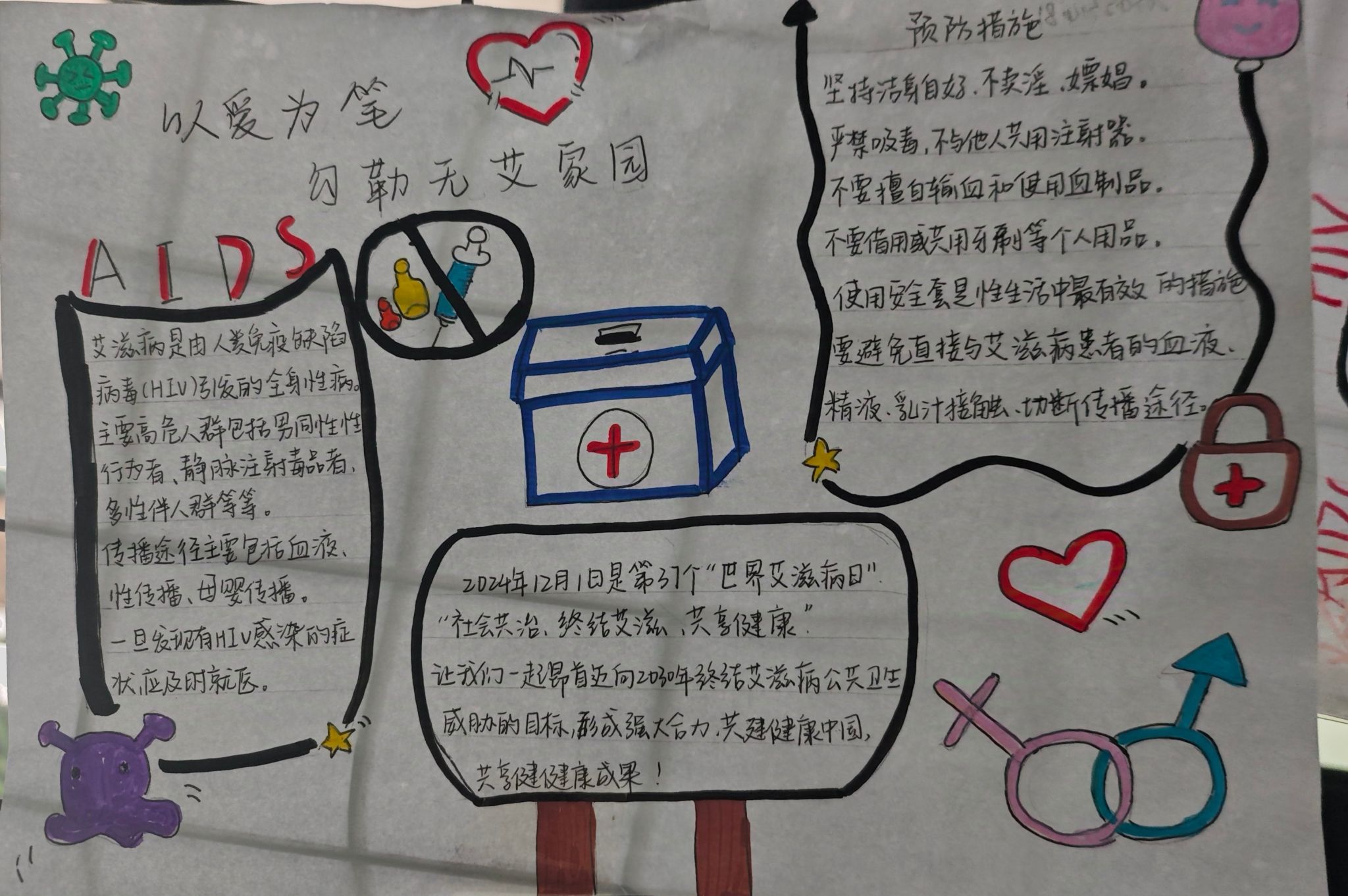 为了提高同学们对艾滋病的认识和防范意识,近日,“红丝带”禁毒防艾志愿服务专项支队举办了一场以 “以爱为笔,勾勒无艾家园” 为主题的手抄报活动。此次活动吸引了全校各年级同学的积极参与,他们用手中的画笔和丰富的想象力,创作出了一幅幅内容丰富、形式多样的手抄报作品,为校园增添了一抹别样的色彩,也为防艾宣传注入了青春活力。