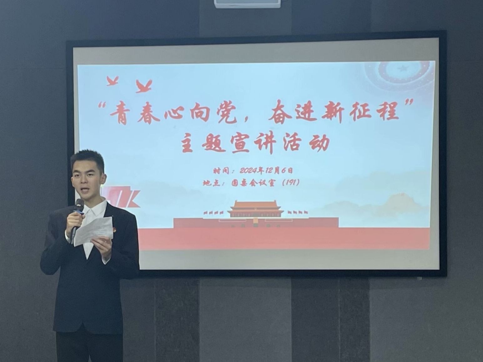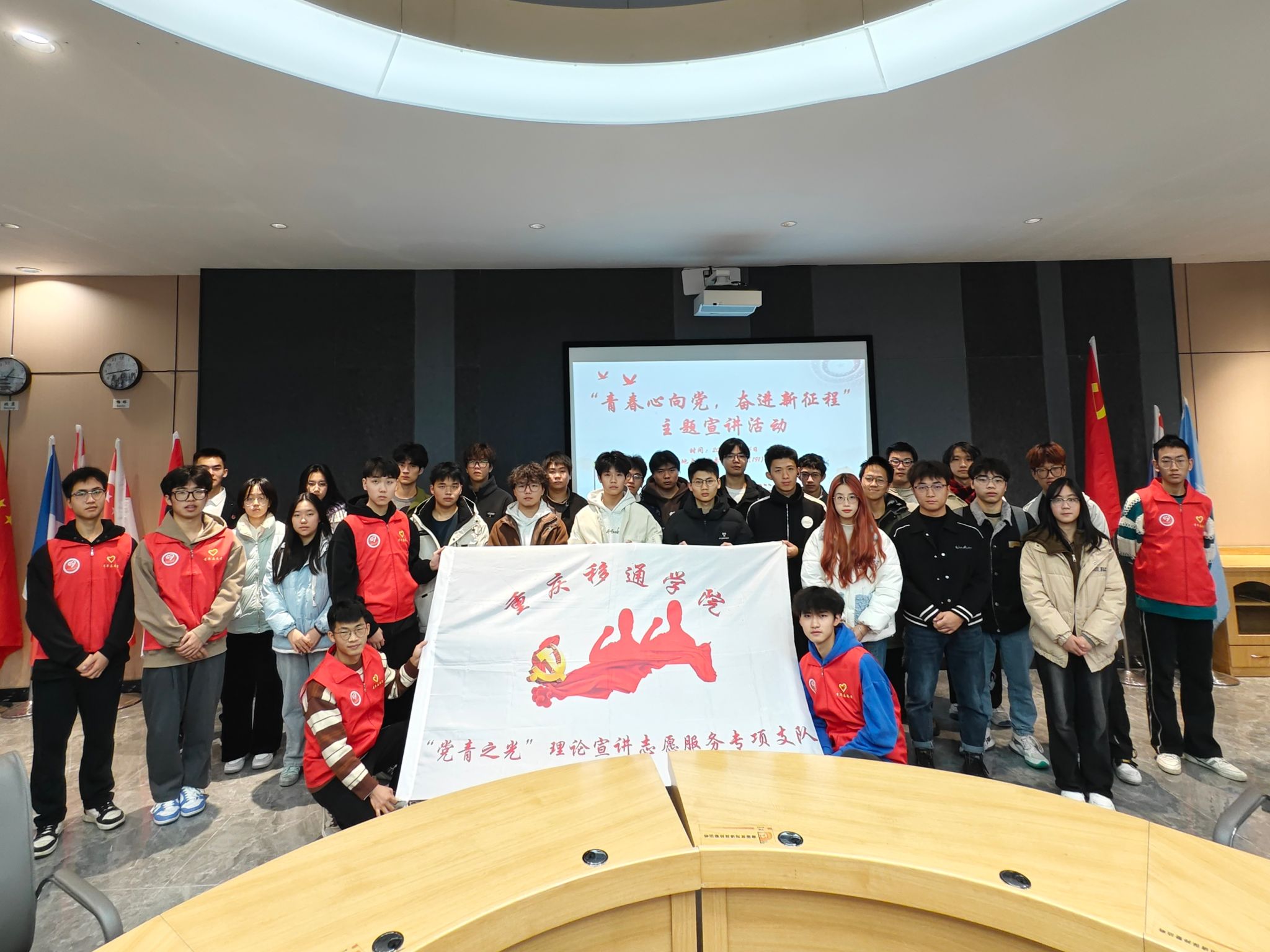 当党徽闪耀的光芒照亮逐梦之路,热血青年们便以信仰为笔。2024年12月6日12点30分,由重庆移通学院通信与信息工程学院青年志愿者协会主办,重庆移通学院通信与信息工程学院青年志愿者协会承办,“党青之光”理论宣讲志愿服务专项支队、2024级通信工程03支部协办的“青春心向党,奋进新征程”系列活动在南湖书院报告厅顺利开展。